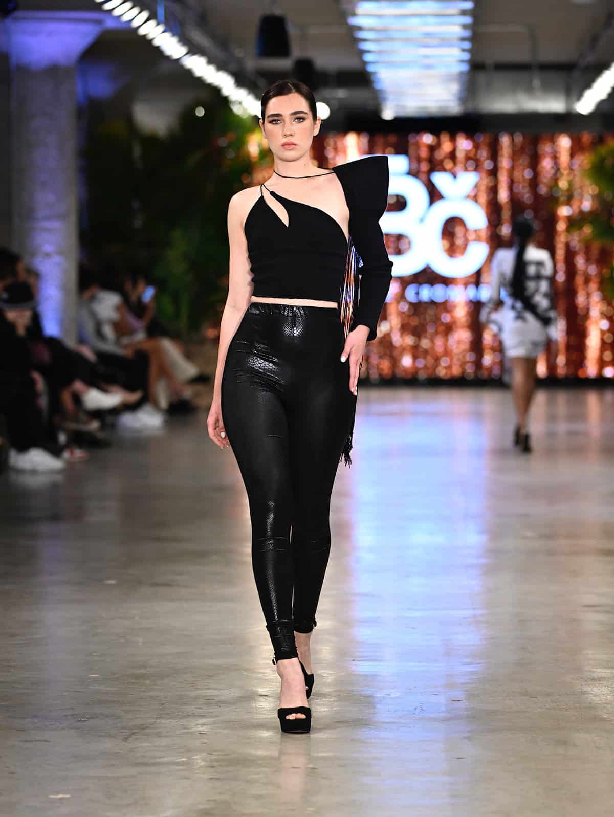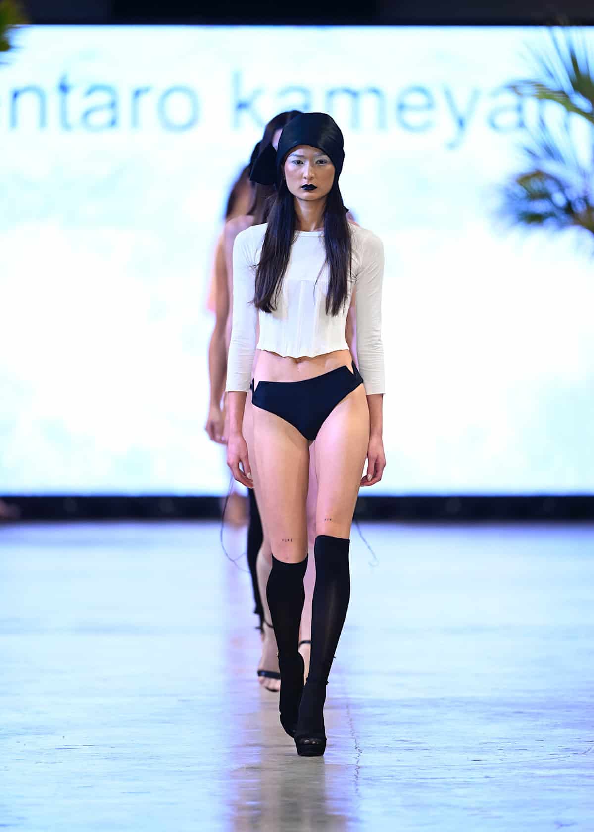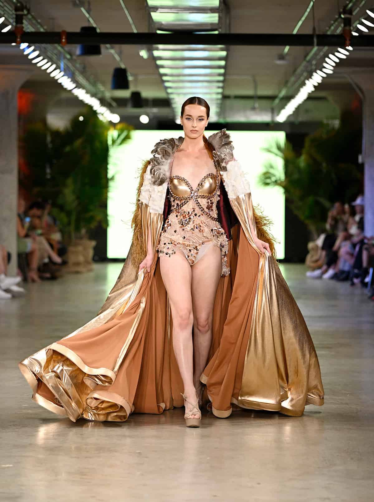 Gyv Me Body opened up the second night with hot colors and glamorous, shimmery details, followed by Bad Sisters‘ collection in which the play of the patterns were poppingly eye-catching. The look demonstrated in the brand’s image below shone brilliantly in the spotlights: the sharp design of the collar complemented the delicacy of the short skirt and classic botanical motif, and the thigh-high boots and corset matched the skirt set in a look that dared anybody to doubt. The show continued with Body Glove and Bikini Beach, and with Alexis Monsanto and Natalia Fedner (see featured image). Every Alexis Monsanto model wore clothing of dreamlike weightlessness, and headpieces simulating butterflies flying round the head. Ukrainian-born designer Natalia Fedner, off in another direction, showed her specialization in metal couture, leaving guests speechless.