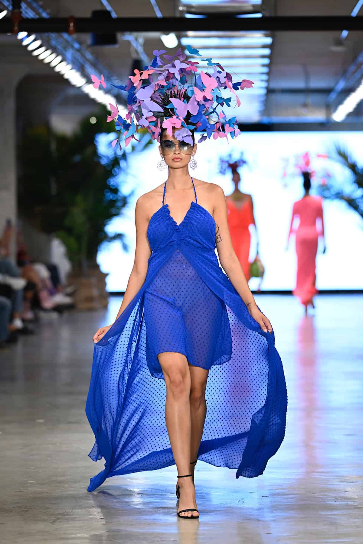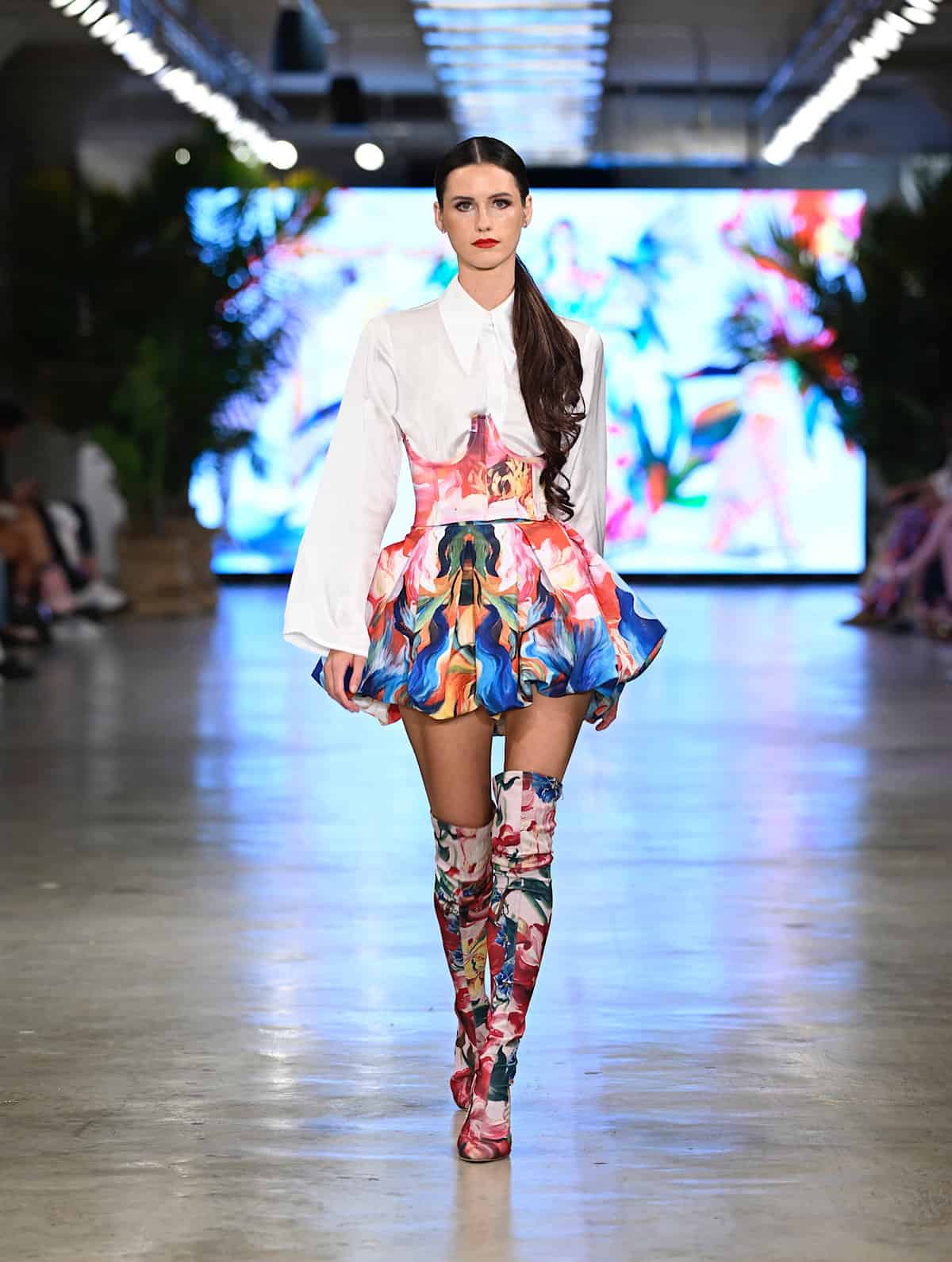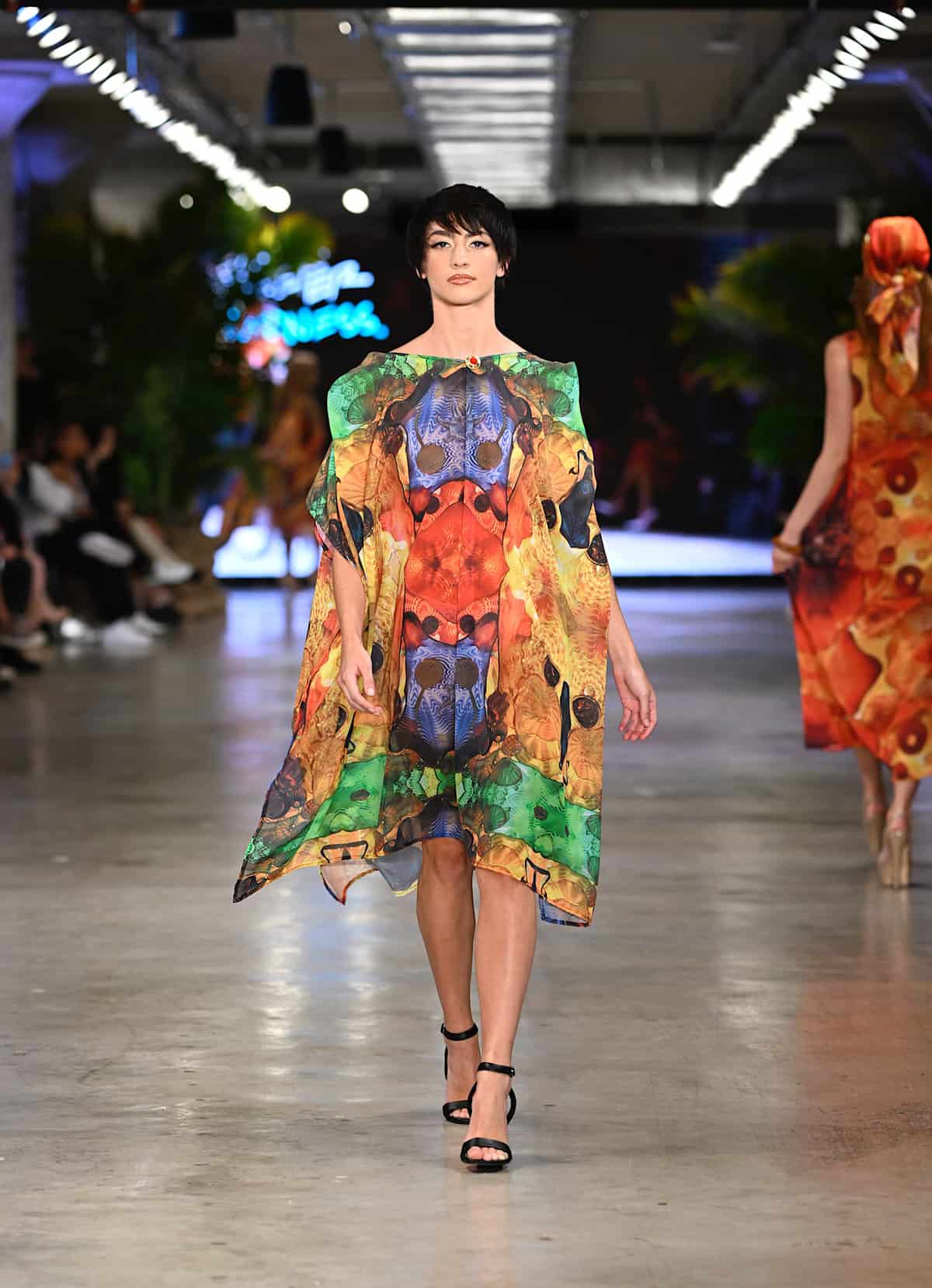 Gyv Me Body opened up the second night with hot colors and glamorous, shimmery details, followed by Bad Sisters‘ collection in which the play of the patterns were poppingly eye-catching. The look demonstrated in the brand’s image below shone brilliantly in the spotlights: the sharp design of the collar complemented the delicacy of the short skirt and classic botanical motif, and the thigh-high boots and corset matched the skirt set in a look that dared anybody to doubt. The show continued with Body Glove and Bikini Beach, and with Alexis Monsanto and Natalia Fedner (see featured image). Every Alexis Monsanto model wore clothing of dreamlike weightlessness, and headpieces simulating butterflies flying round the head. Ukrainian-born designer Natalia Fedner, off in another direction, showed her specialization in metal couture, leaving guests speechless.