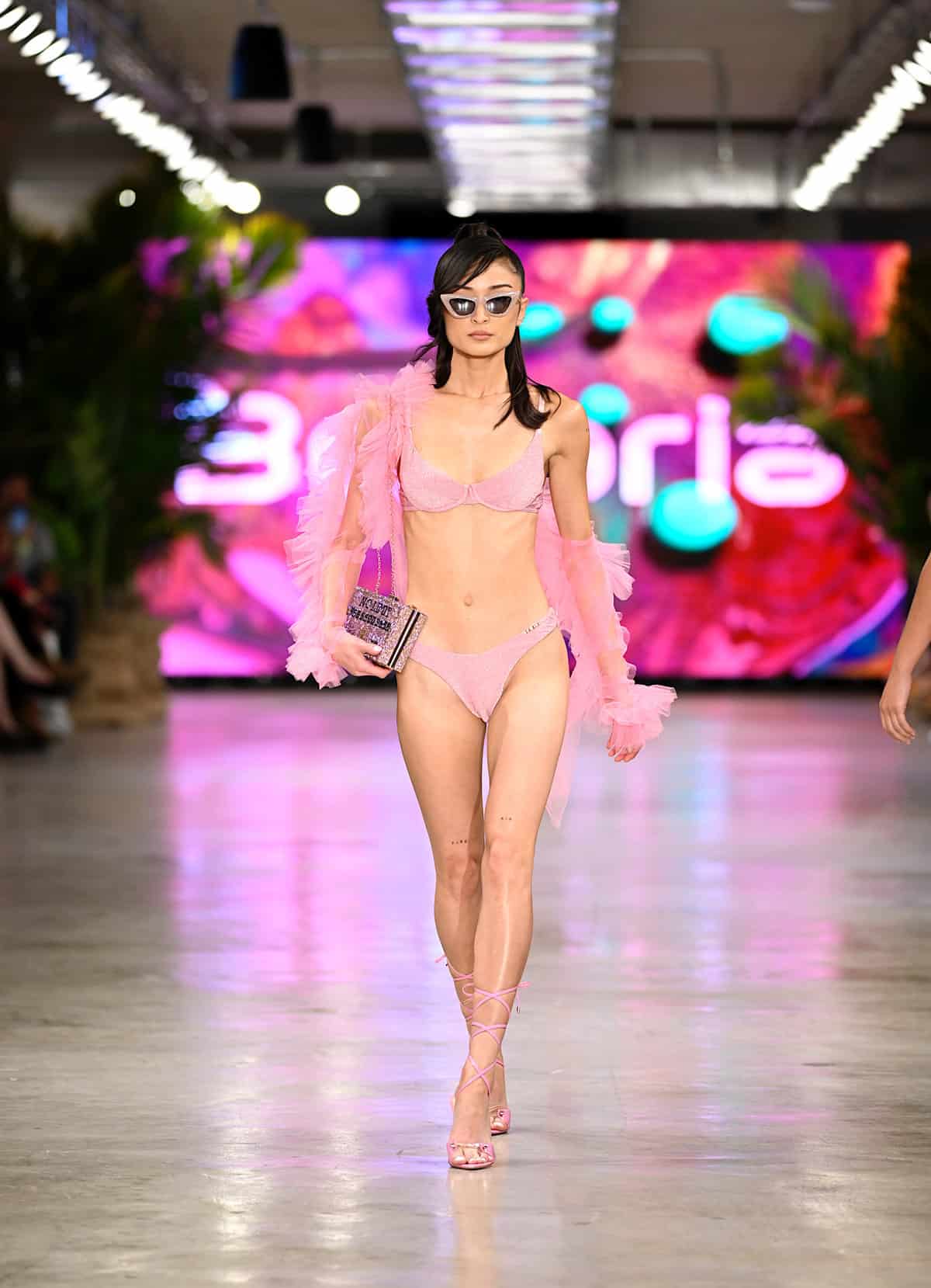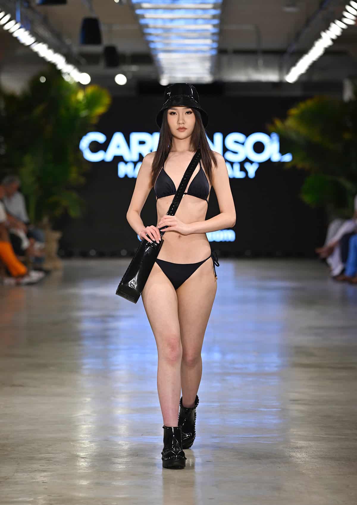 Second to last day of shows began with Lybethras on the runway, showing adaptations of known swimwear models with specialized tailoring and shaping. Then Carmen Sol presented designs alongside accessories in the exhibition at their pop-up, focusing on hats and bags made of high-quality Italian PVC. The first block of the event finished with Bishme Cromartie, whose creations emphasized shoulders, as seen on a shawl arm sleeve piece, and resort-wear dresses. Patterns created with the brand’s initials vibrated with originality, many pieces being made with scale patterns, these being true showstoppers.