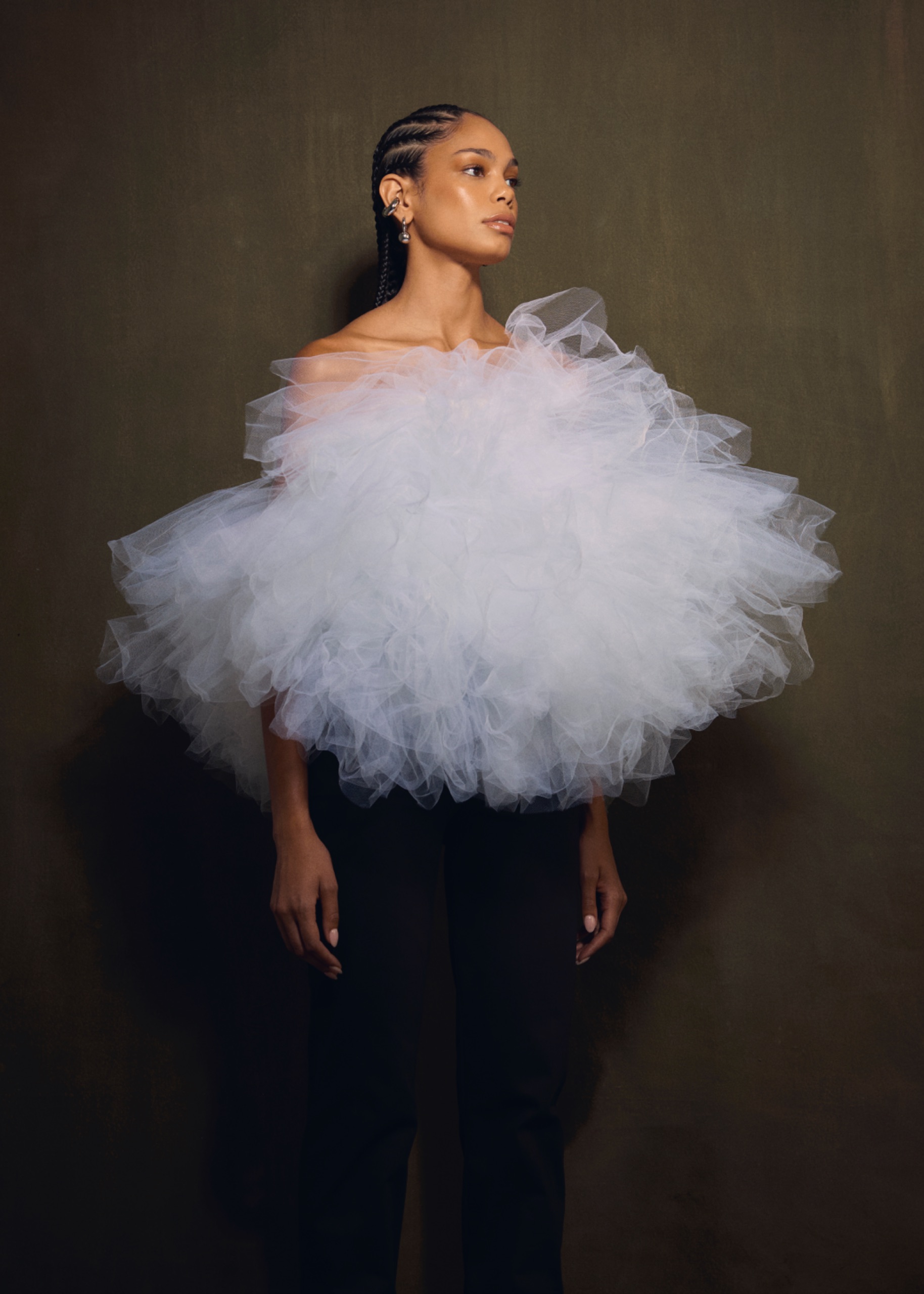 The collection’s emphasis on proportions and function is equally noteworthy. Cromartie experiments with exaggerated silhouettes and unexpected shapes, creating garments that push boundaries while remaining wearable. Whether through voluminous skirts or sharply tailored pants, each piece exudes a sense of empowerment, allowing the wearer to make a bold statement in any setting. This adaptability speaks to Cromartie’s vision of the modern woman: someone who is unafraid to embrace both strength and vulnerability, masculinity and femininity, in her personal expression.