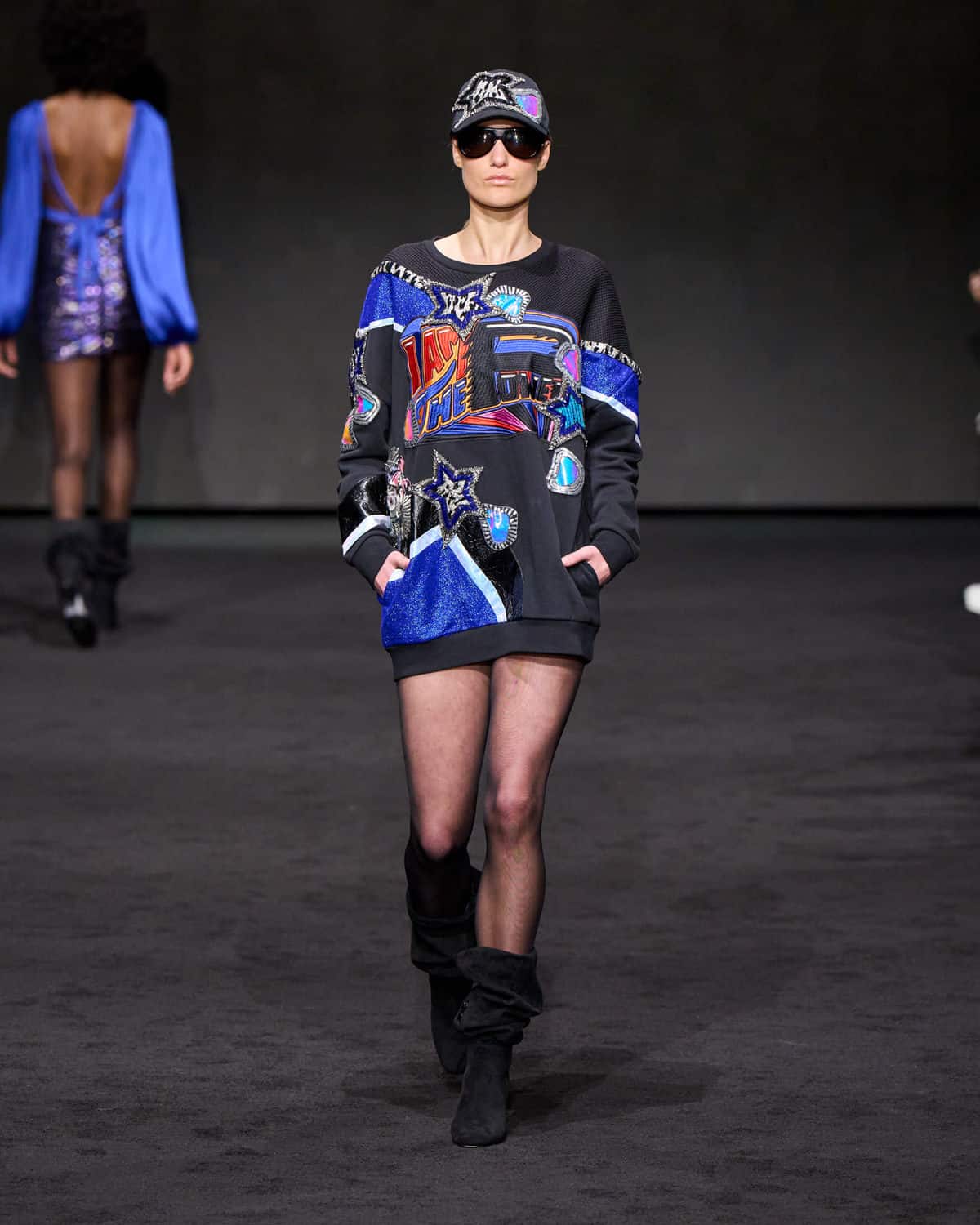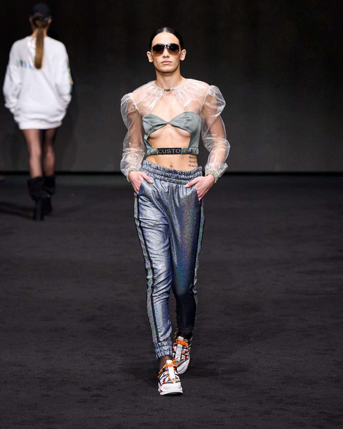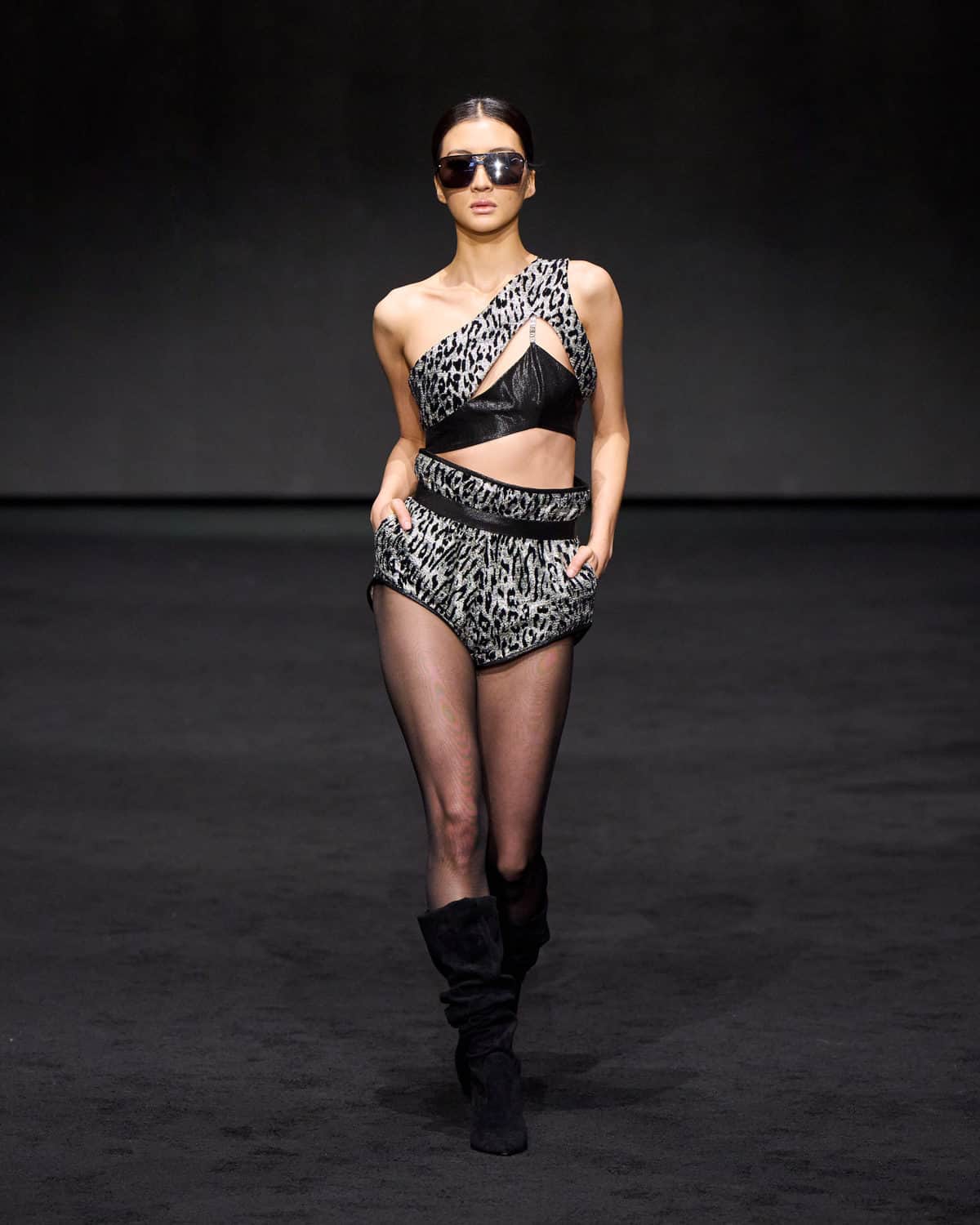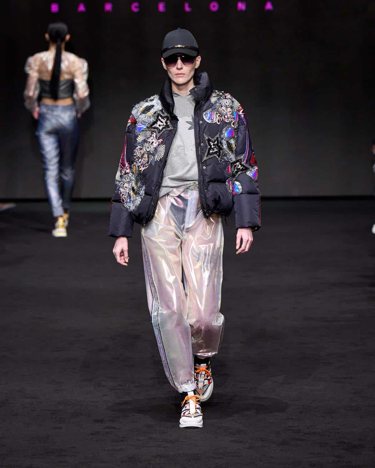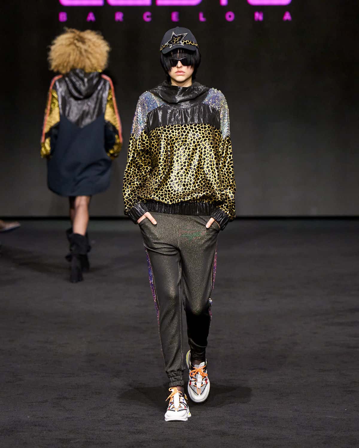 There was a resplendent variety of pieces in vibrant colors. Among a predominance of black and white purple and other cooler hues were shining, along with designs in radiant gold. Most outfits had a huge athleisure influence, intertwined with glam energy. That was perceptible in many holographic fabrics and sequin designs. Jaguar patterns stood out, reminding us that—after a time during which some trends from the beginning of the millennium had come to seem very outdated—a lot of them are now coming back strong. Volume was an essential aspect of these garments: turtlenecks, balloon and oversized sleeves with movement were hugely present.