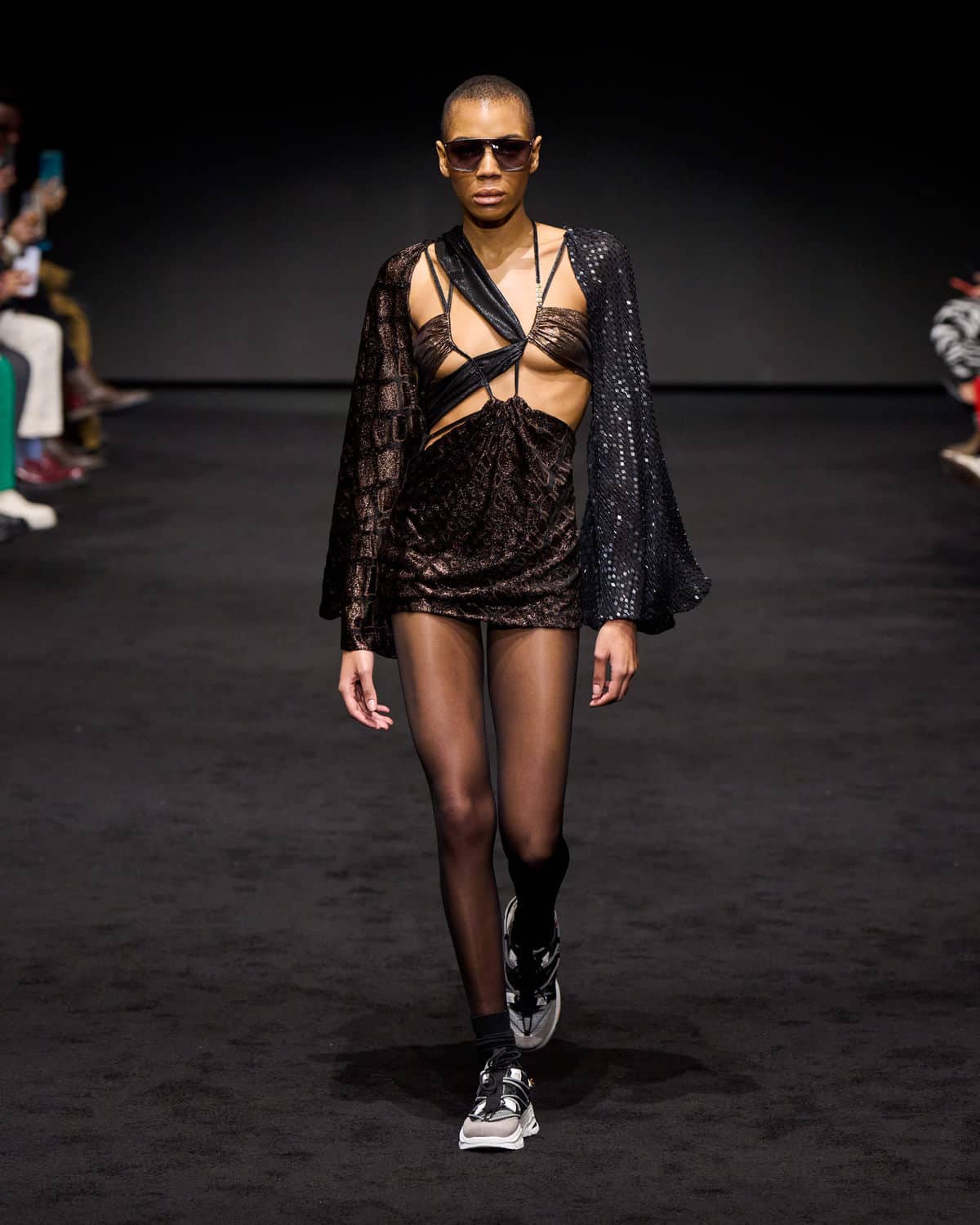 The Sunday show featured original and exciting tailoring, which included skin appearing through cuts in clothing. Much was mini: miniskirts and high rise short shorts; sweatshirts, and hoodies as dresses. The cut-out structures were often asymmetric, combining with black tights and exuding classic and sophisticated energy, despite the modern dominance.