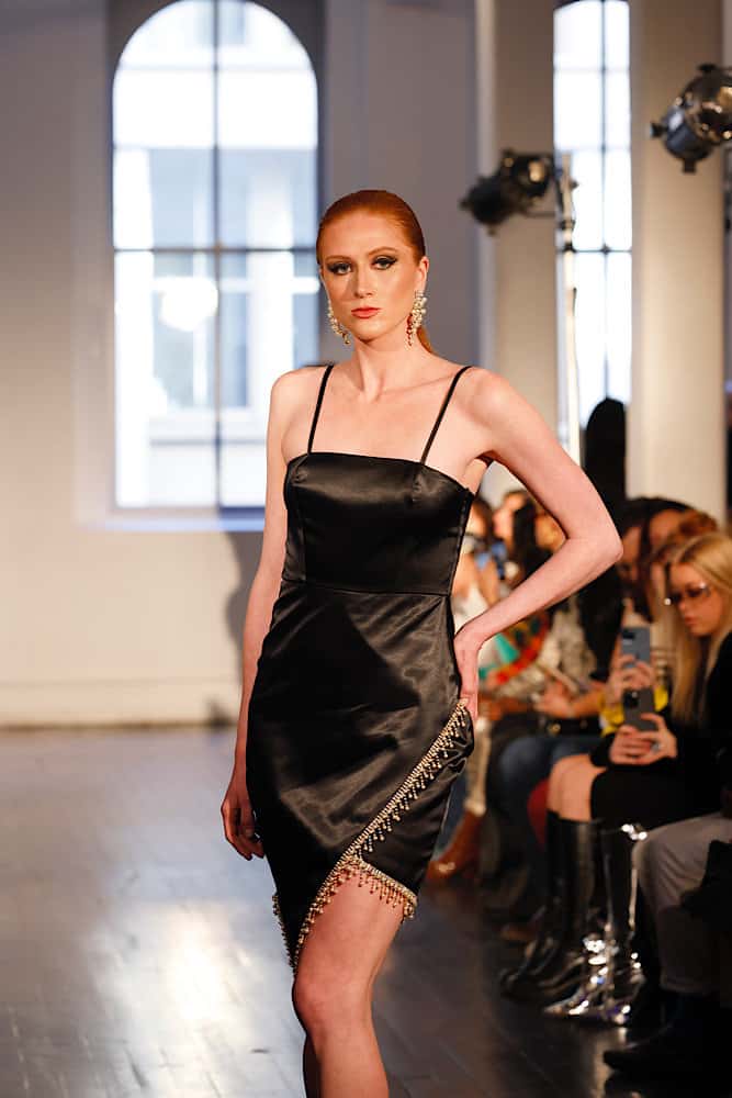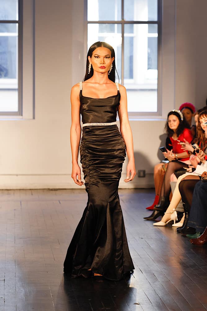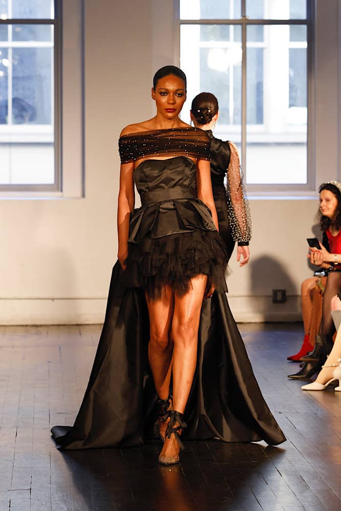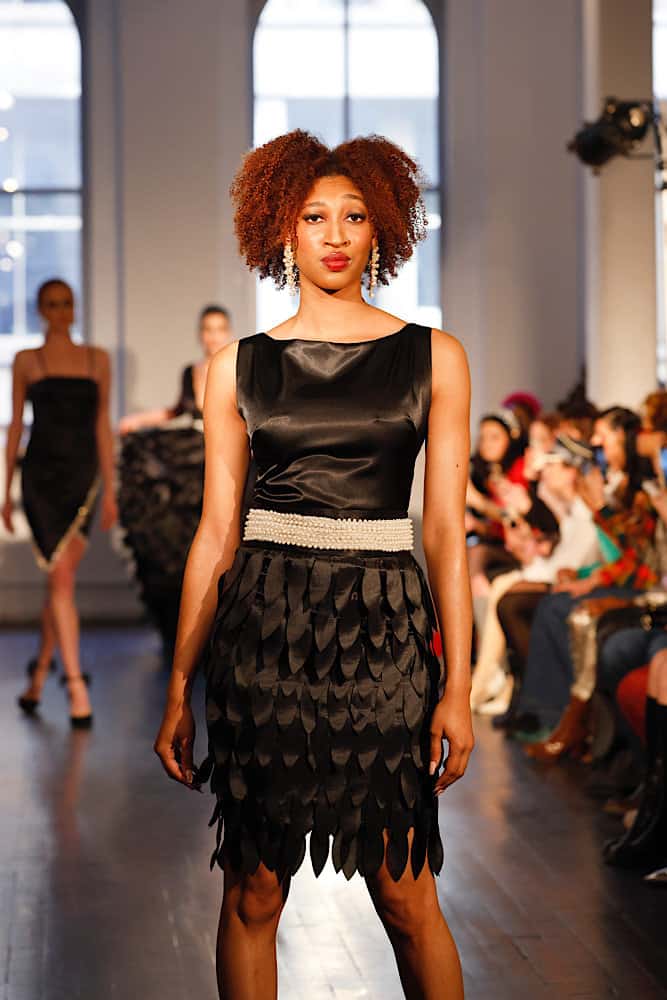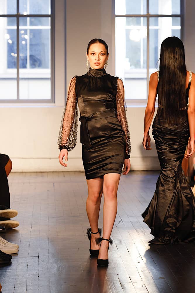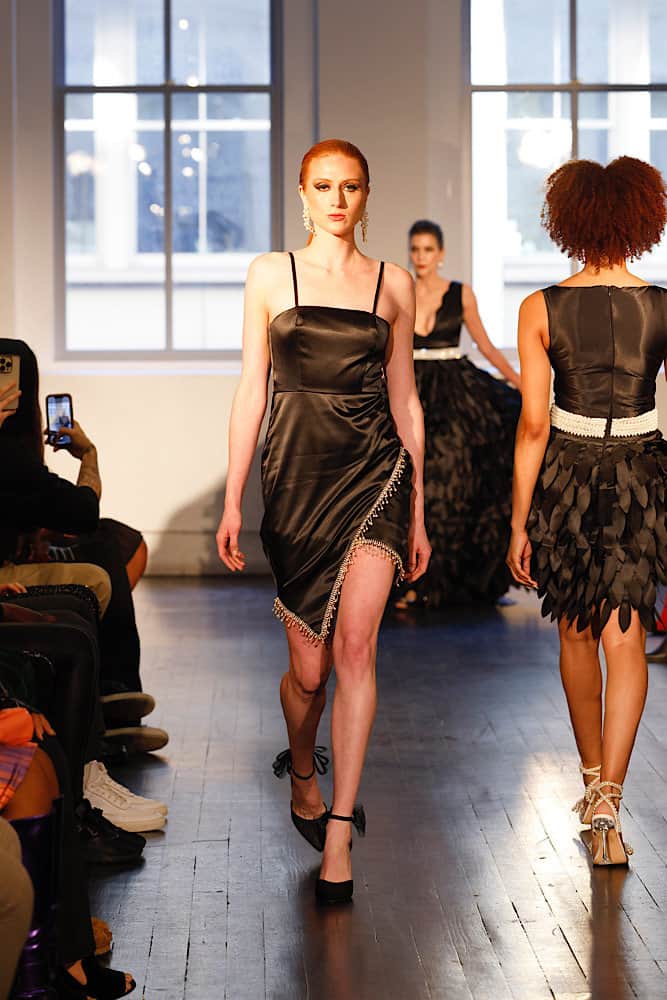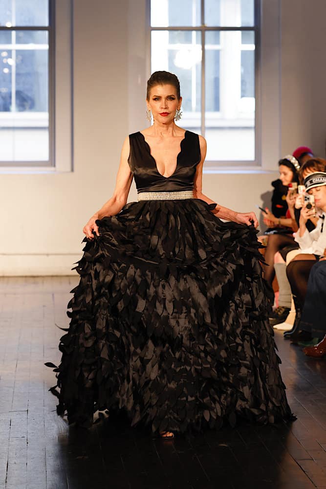 The “Emerge” runway show featured several stunning looks, including a black satin pearl trim petal gown worn by supermodel Debbie Dickinson. It was elegant and sophisticated, with a plunging neckline that added a touch of drama. A shorter version of the dress with a rounded neckline was also on display, perfect for a less formal occasion. A black satin fringe piece, also adorned with pearls, had a bit of a playful vibe, while supermodel Mimi Tao showcased a floor-length satin mermaid gown. The most iconic look of the collection was a dramatic gown featuring a tutu with mesh wrap and an overskirt, decorated with pearl details along the shoulders.