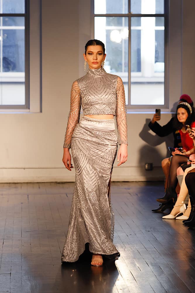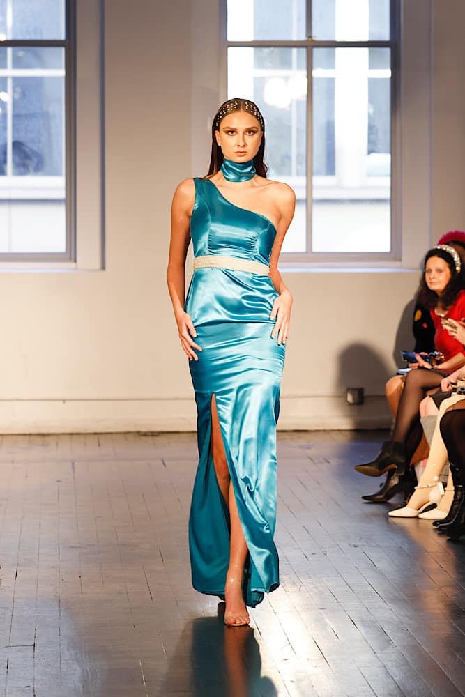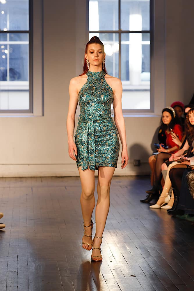 The blue satin pieces provided a bold and striking contrast to the rest of the collection, tying the pieces together and providing a cohesive look throughout. Overall, Scott’s collection was a visually stunning display of fashion-forward designs, with the use of various textures, embellishments, and colors providing a dynamic and unique collection that is sure to turn heads on the runway and in real life.