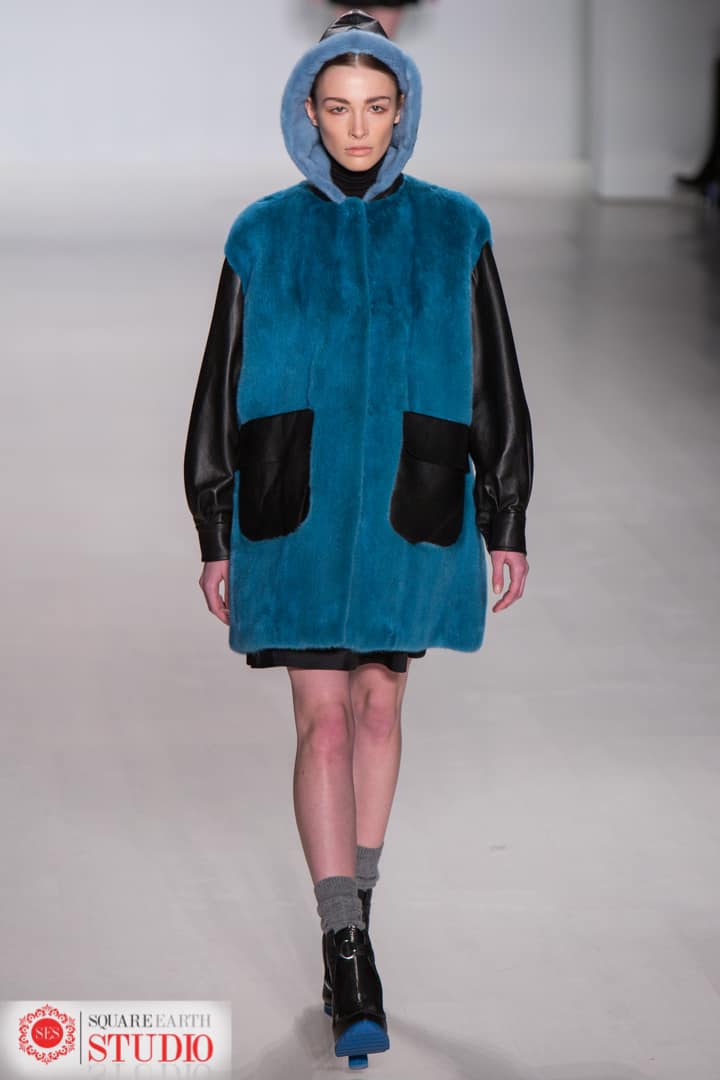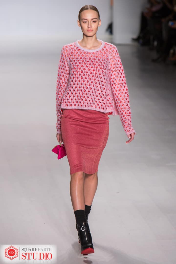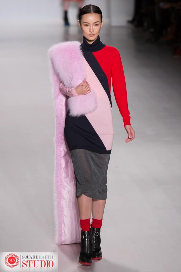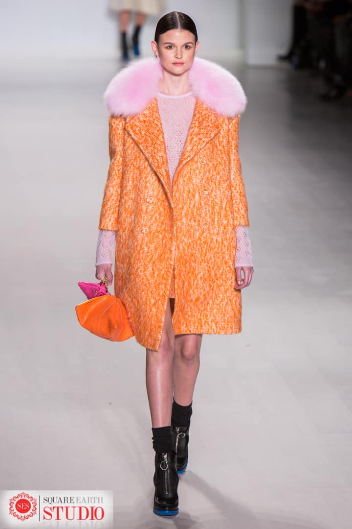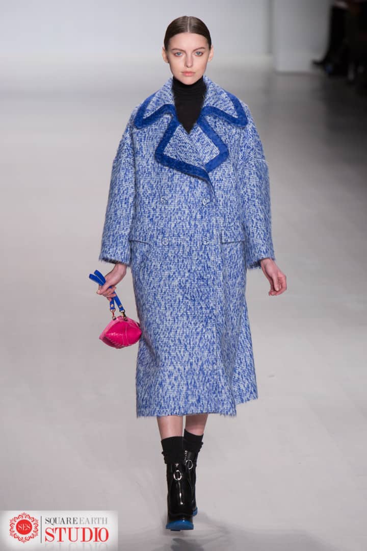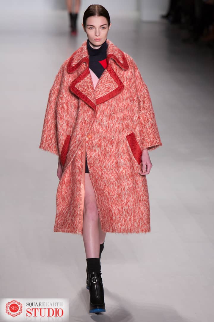 Brilliantly colored coats in boxy silhouettes offered plenty of room for layering, which is perfect for fashionistas who want to remain stylish in frigid temperatures. Ranfan made excellent use of color blocking with plush, body hugging sweaters. A stunning sherbert color palette offered soft raspberry and lightly hued orange. It was also surprising to see a wide range of complementary colors.
