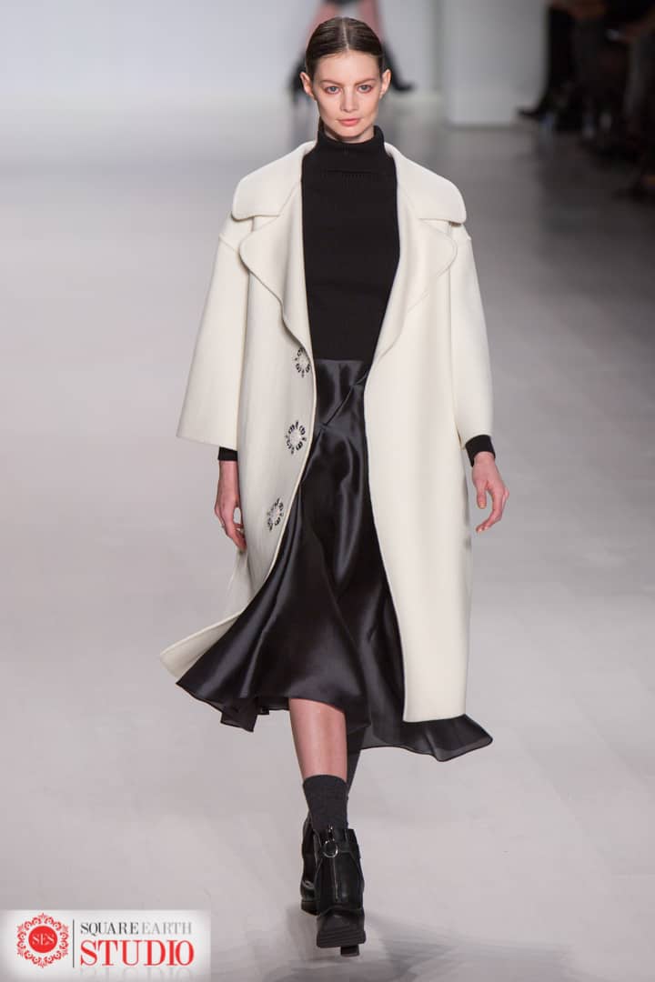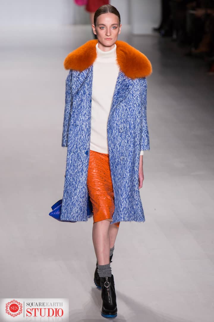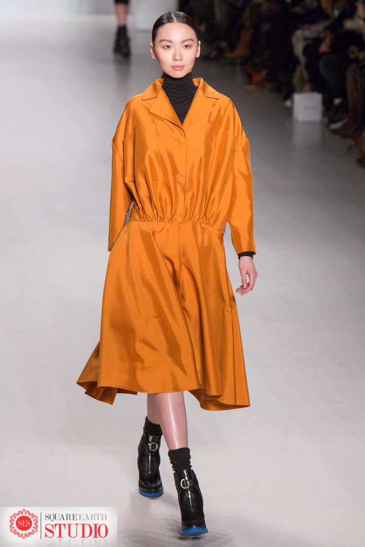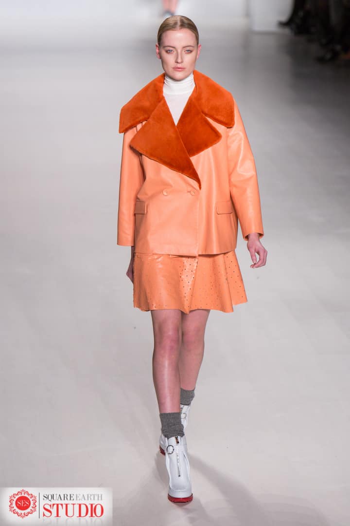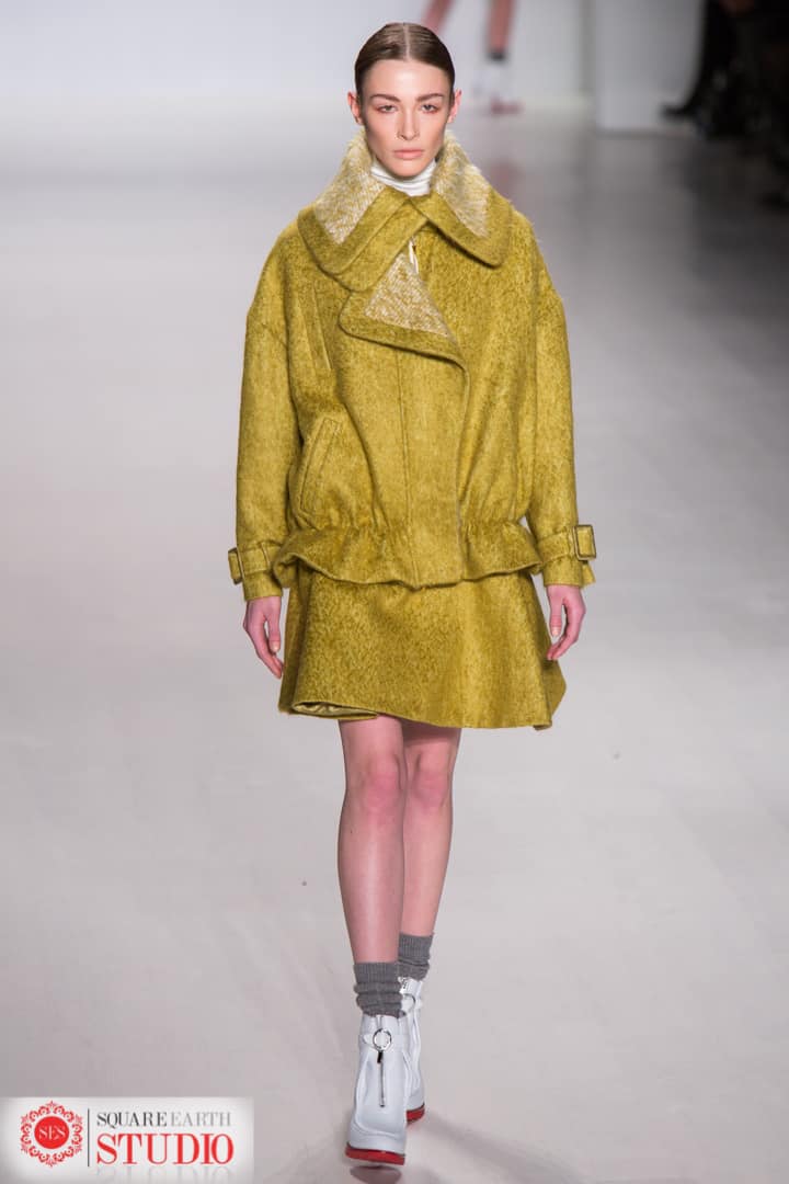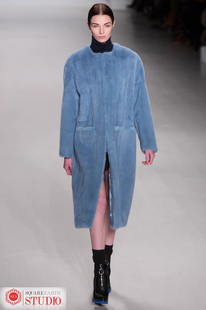 Brilliantly colored coats in boxy silhouettes offered plenty of room for layering, which is perfect for fashionistas who want to remain stylish in frigid temperatures. Ranfan made excellent use of color blocking with plush, body hugging sweaters. A stunning sherbert color palette offered soft raspberry and lightly hued orange. It was also surprising to see a wide range of complementary colors.