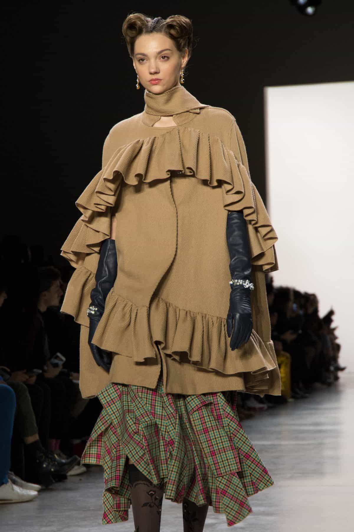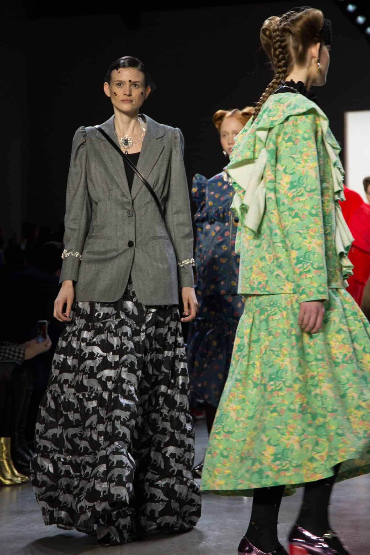 Heaven Please by Lary Cheung & Yi Chan presented the sweetest 12 piece collection called “Girl, You’ll be a Woman Soon”, inspired by Princess Diana and traditional British royal costumes. It’s full of ruffles and flowery prints on flowy long-sleeved dresses paired with sneakers and boots. The far from dreary color pallet includes pink, yellow, lilac, plum, and green along with pops of metallic to keep you feeling alive and vibrant! This design duo graduated from the Hong Kong Polytechnic University and launched their first collection in 2012.