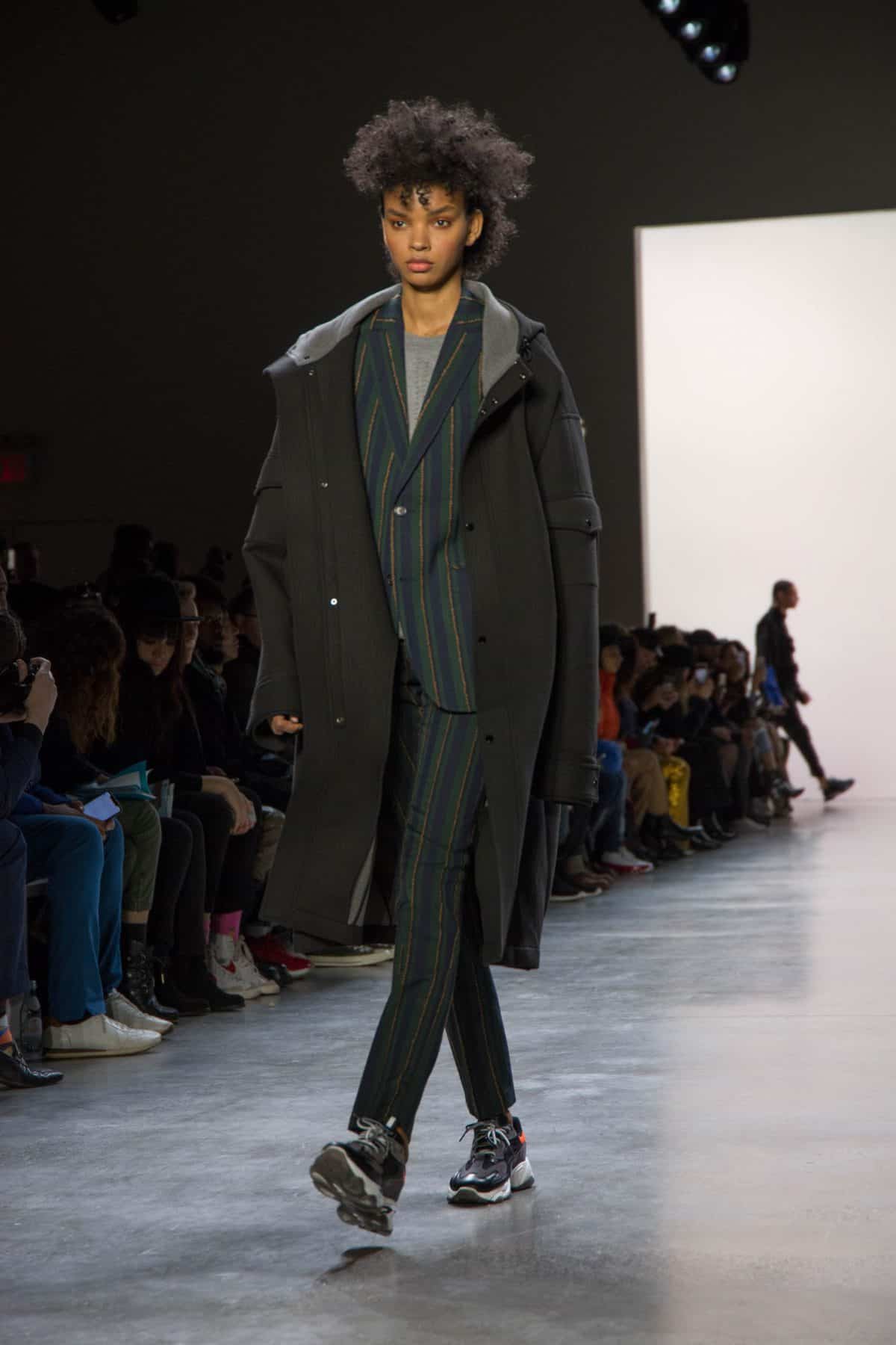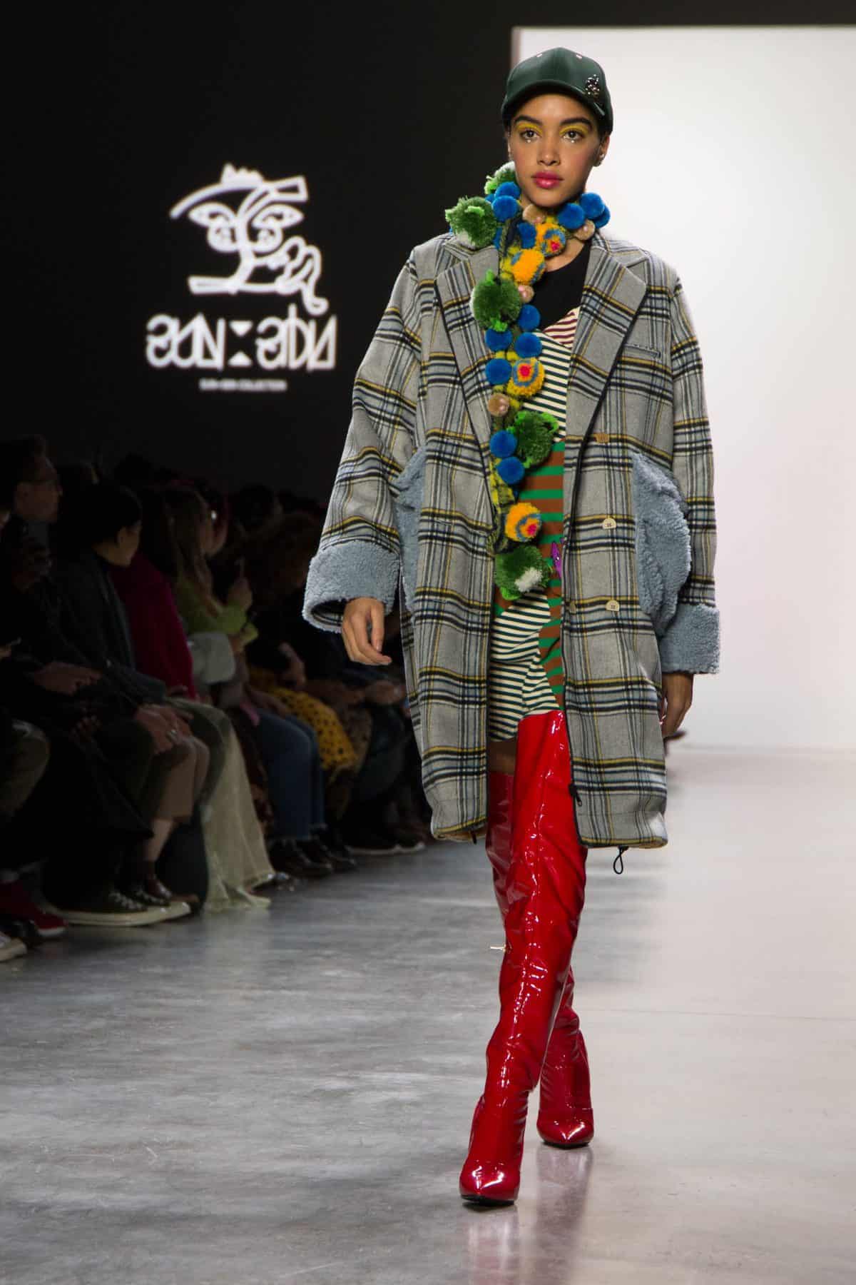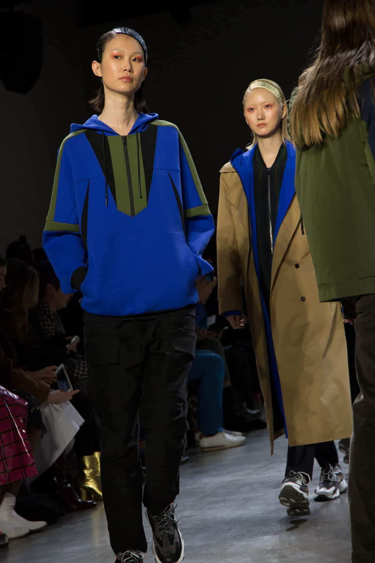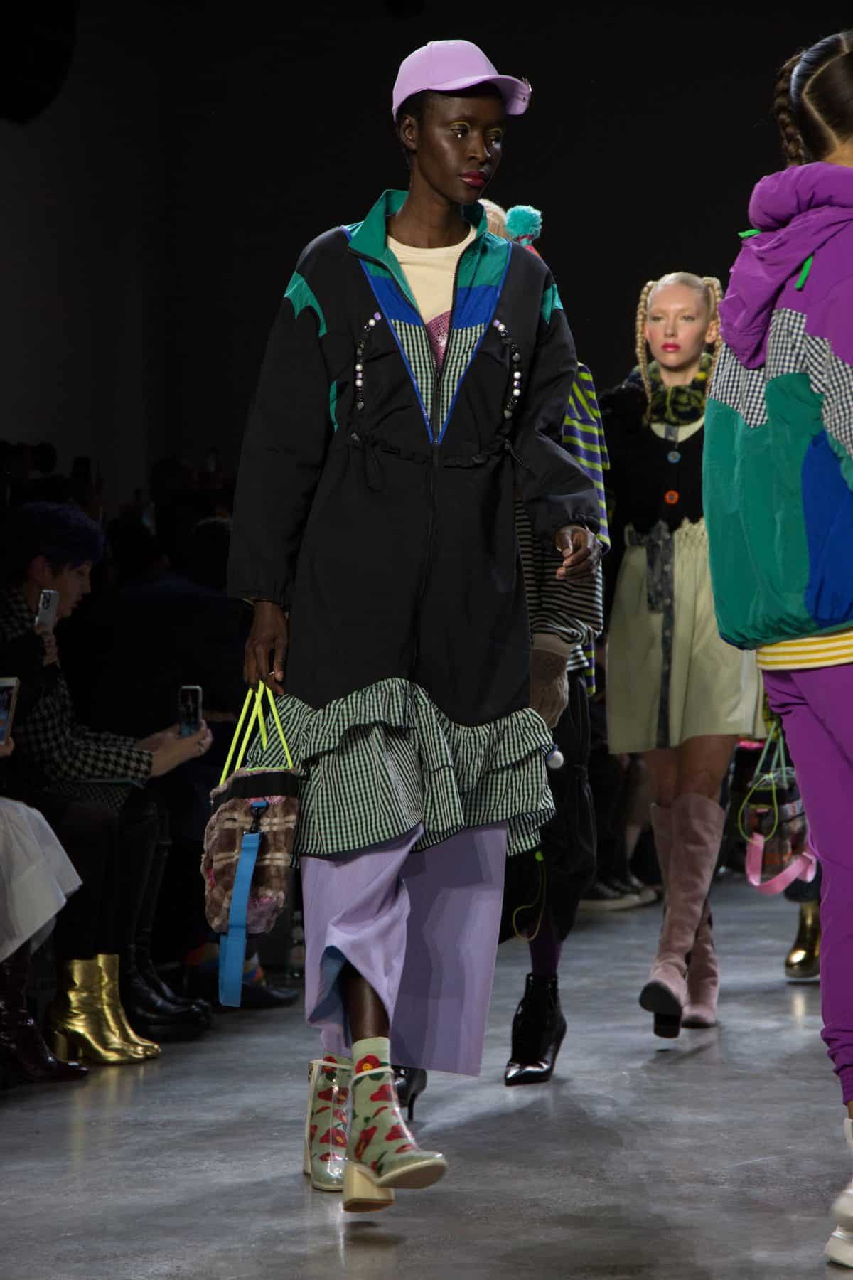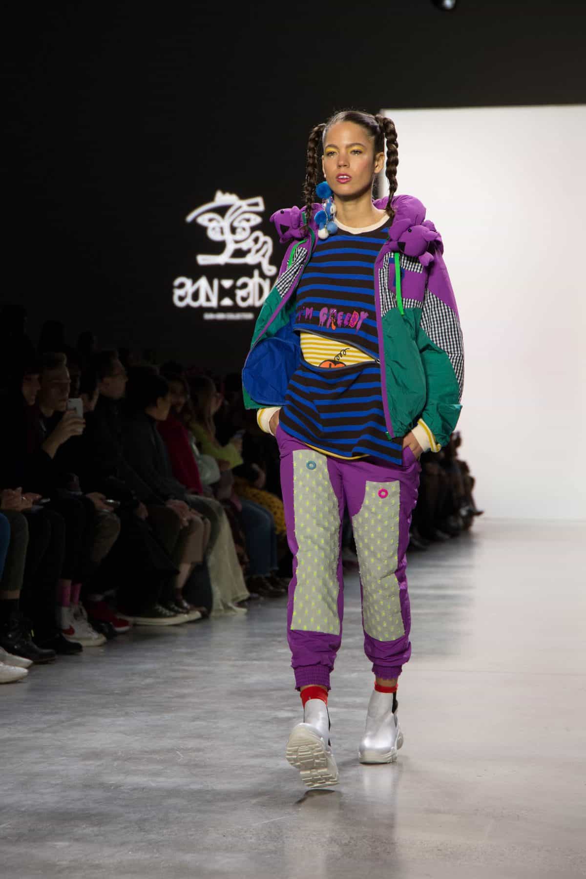 Sunequalsen by Sun Lam, brought a super playful and fun 12 piece collection called “I Swear I’m a Nice Ghost”, inspired by the character, The Nice Ghost, who teaches people to not get caught up in stereotypes and stigmas. The models walk the runway in sporty workwear with youthful accents of pom poms and fuzzy ears. Blacks and Earth tones were brought to life with bright neons of pink, yellow, and green with bright blues, lilac purple, and an array of mixed prints, rainbow-striped socks, and sparkly shoes. Sun Lam has degrees from both the Hong Kong Polytechnic University and the Winchester School of Art in which she graduated with distinction in 2015.