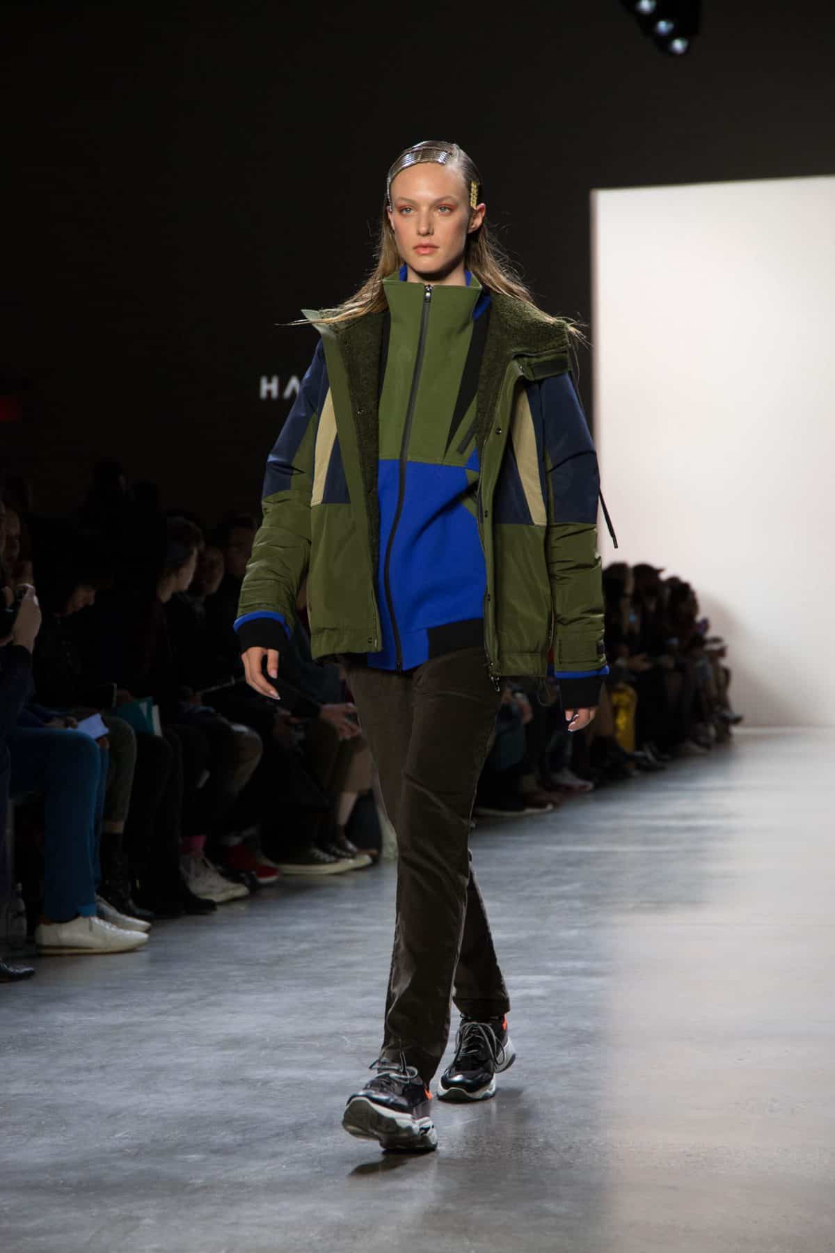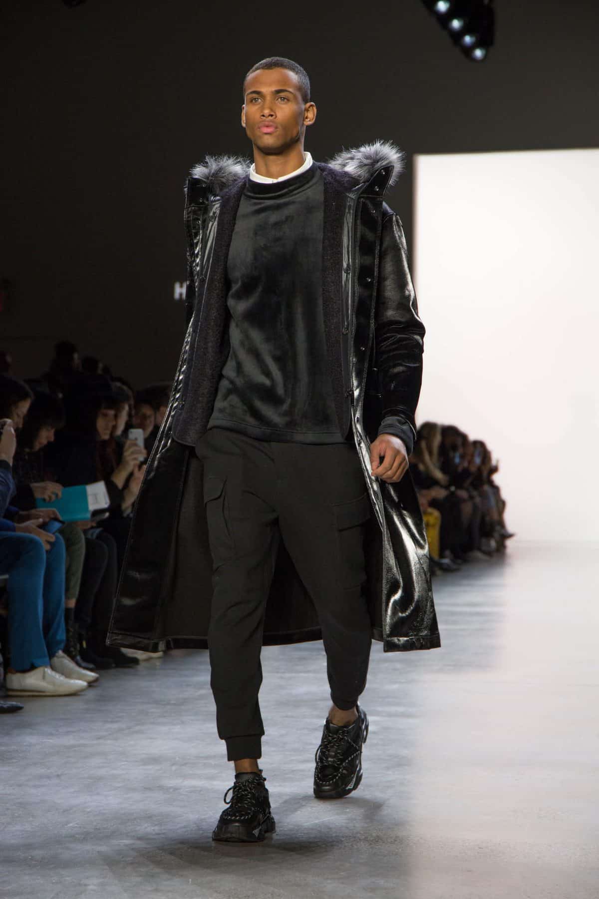 Harrison Wong’s 12 look collection, “Abstract Composition”, displays his fascination with abstract visual art. Classic tailoring with the use of color blocking and contrasting colors of peach, olive, bright blue, beige, and black, along with mixed textures of glossy and matte materials provide a heightened level of contrast in this sporty meets sophisticated collection. This award-winning designer is a graduate of the London College of Fashion and opened his first retail shop in Hong Kong in 2014.