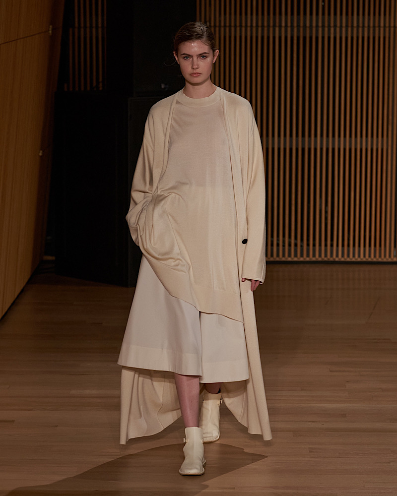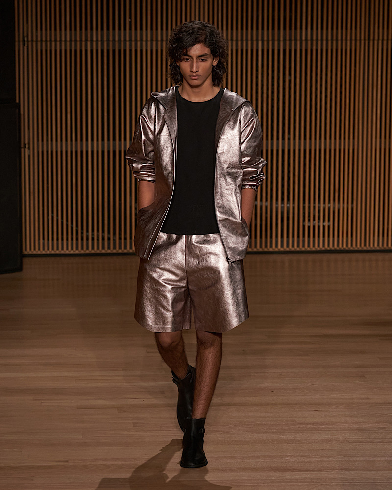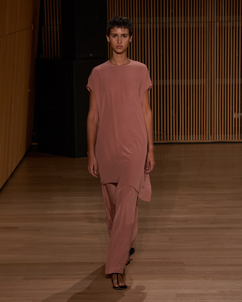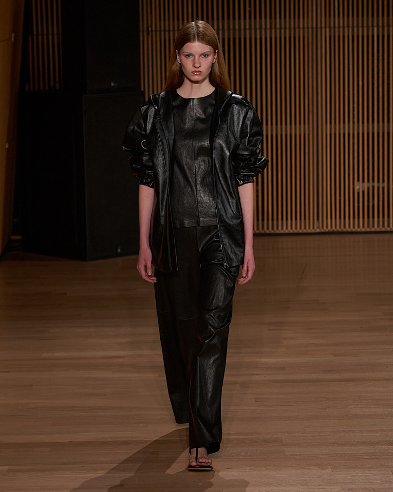 Ensemble options are tiered, layered, and overlapping, embodying a casual approach to appearing fully dressed. FFORME’s surfaces maintain a sleek, smooth quality, as seen in the felted wool of a cashmere cardigan and the near-seamless metallic leather hoodie. The color palette resonates with pillar tones of black, navy, crème, and off-white, complemented by a spectrum of sea rose, deep amber cady, blushed silk crepe, and earthy knits in shades of taupe and pink.