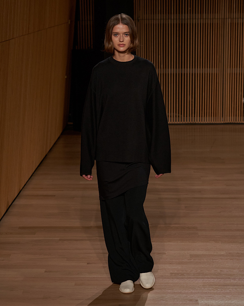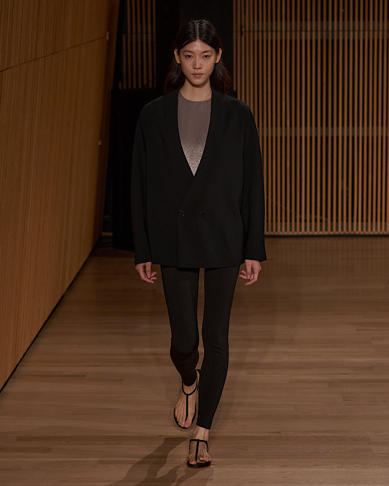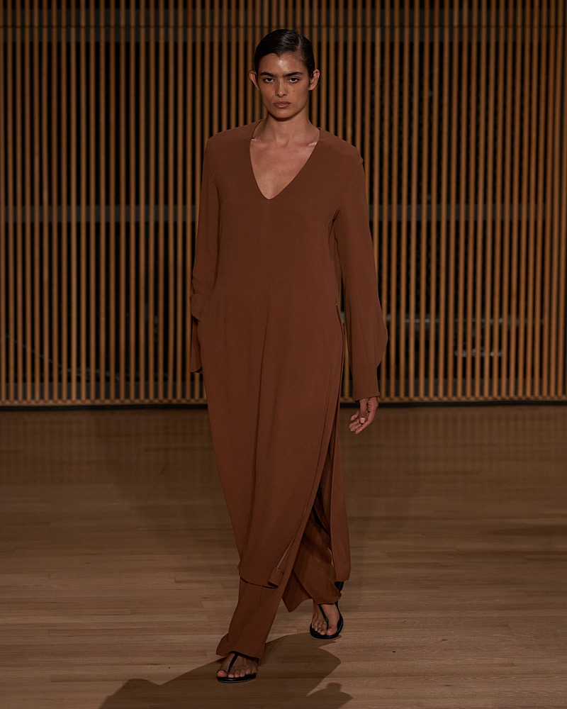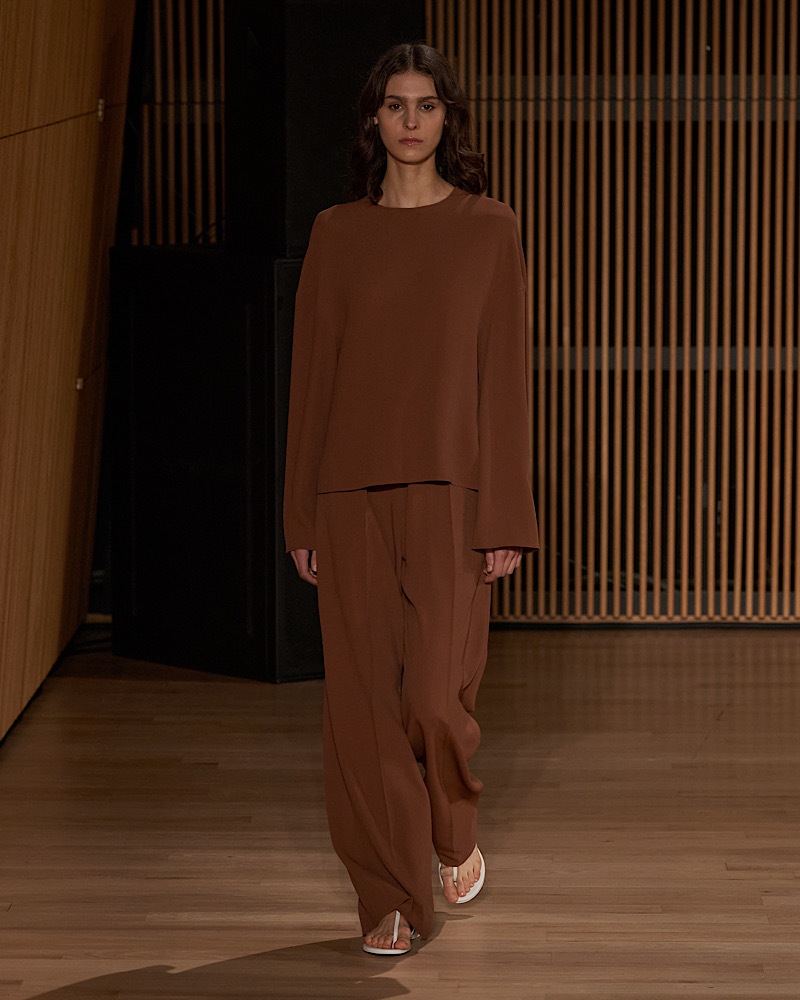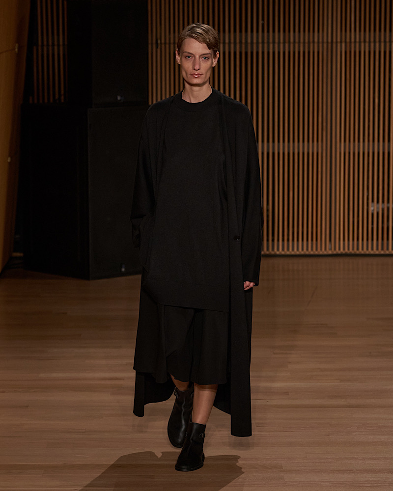 Ensemble options are tiered, layered, and overlapping, embodying a casual approach to appearing fully dressed. FFORME’s surfaces maintain a sleek, smooth quality, as seen in the felted wool of a cashmere cardigan and the near-seamless metallic leather hoodie. The color palette resonates with pillar tones of black, navy, crème, and off-white, complemented by a spectrum of sea rose, deep amber cady, blushed silk crepe, and earthy knits in shades of taupe and pink.
