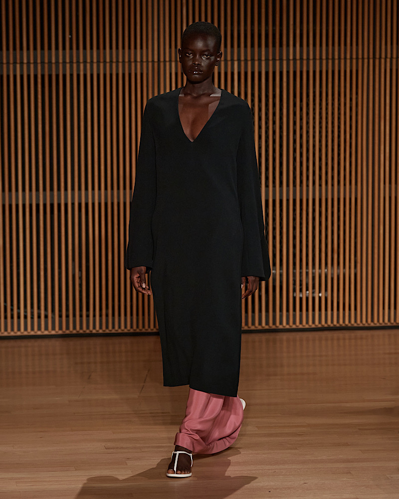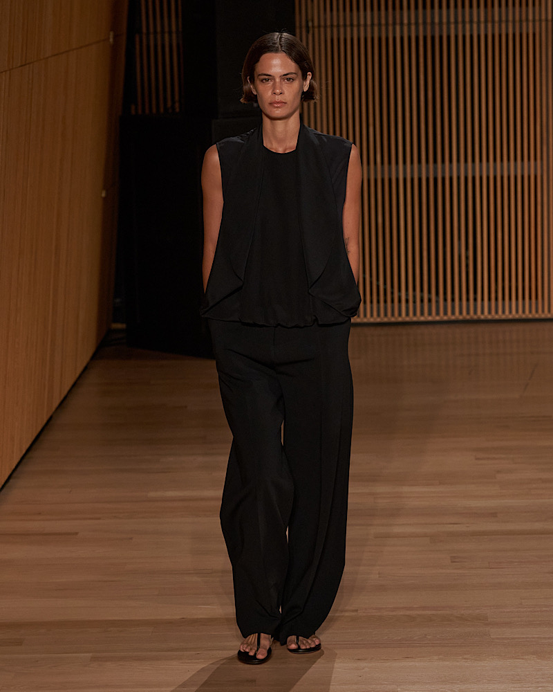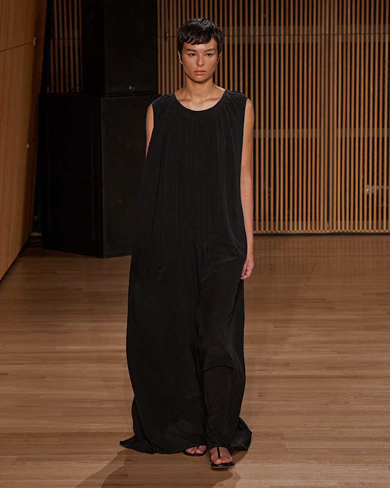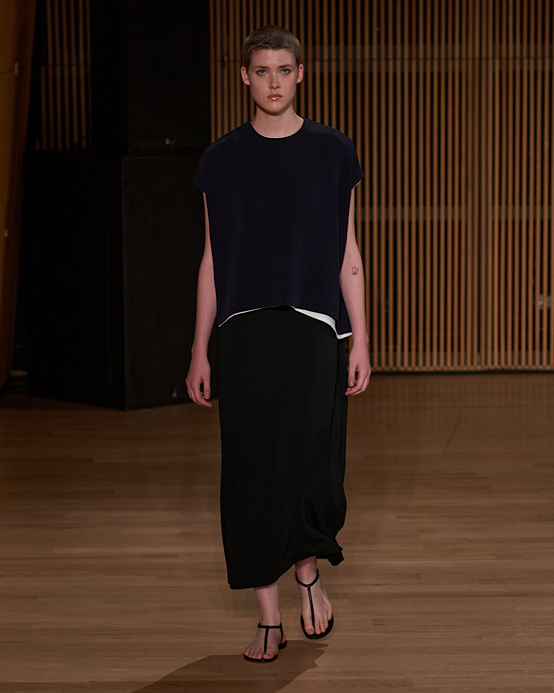 The SS24 collection delves into the metamorphosis of menswear into feminine silhouettes, showcasing a duality between holding and releasing, a design philosophy that permeates each creation. FFORME’s architectural approach is both precise and deliberately elusive. Garments are fully fashioned to anticipate the body’s contours, whether rib-stitch knits with bra detailing and back straps or a curving halter dress crafted from jersey. Some designs defy traditional tailoring conventions, like the relaxed coat with raglan sleeves. Meanwhile, pants, culottes, and shorts feature intricate pin tucks and waistband darts, a signature touch. Among these pieces is a tunic dress, its hidden zippers enabling the transformation from a shirt to a tunic, which is a testament to the brand’s modular wardrobe.