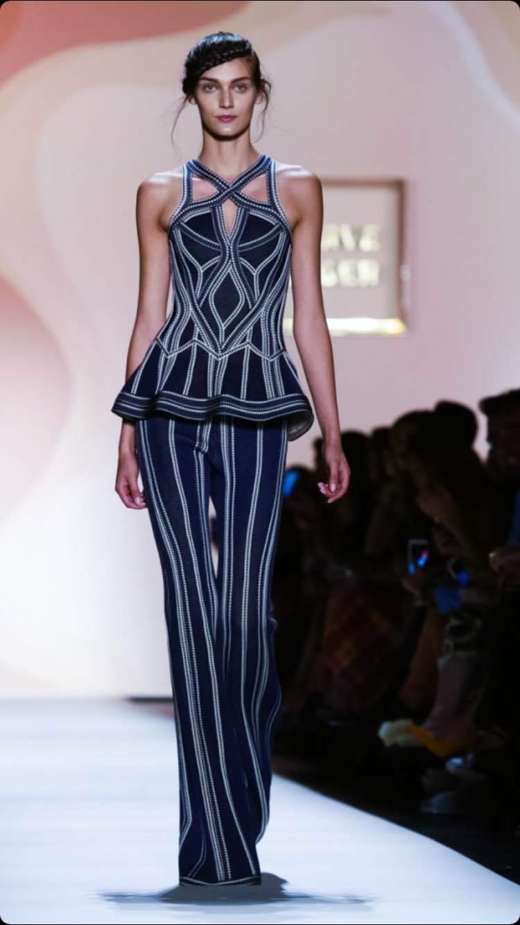 Adding to a night of firsts, pants made a stunning debut on the Herve Leger runway for Spring/Summer 2016! This world famous design house also introduced bold pattern play, including a stylish take on Aztec print, while coupling their new comfort-can-be-sexy vibe with slightly messy updos in the form of a single loose braid wrapped around the crown of the head.