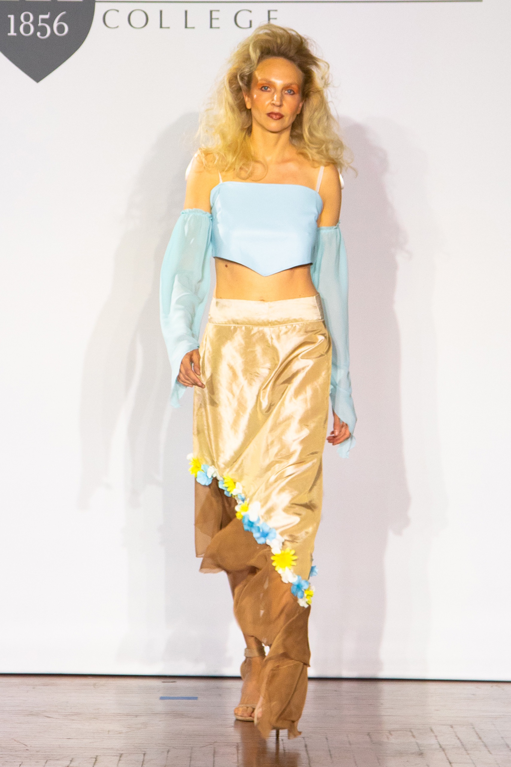 The show began with graduate Mary Quinn, who set a vibrant tone for the evening. Her opening piece featured a floral-embellished cropped bustier paired with a double-layered skirt. Quinn’s use of dimensional floral elements, combined with subtle colorations, captured the essence of spring while maintaining a wearable design. The audience was immediately drawn in by the intricate detailing and the harmonious blend of texture and form, creating an inviting atmosphere for what was to follow.