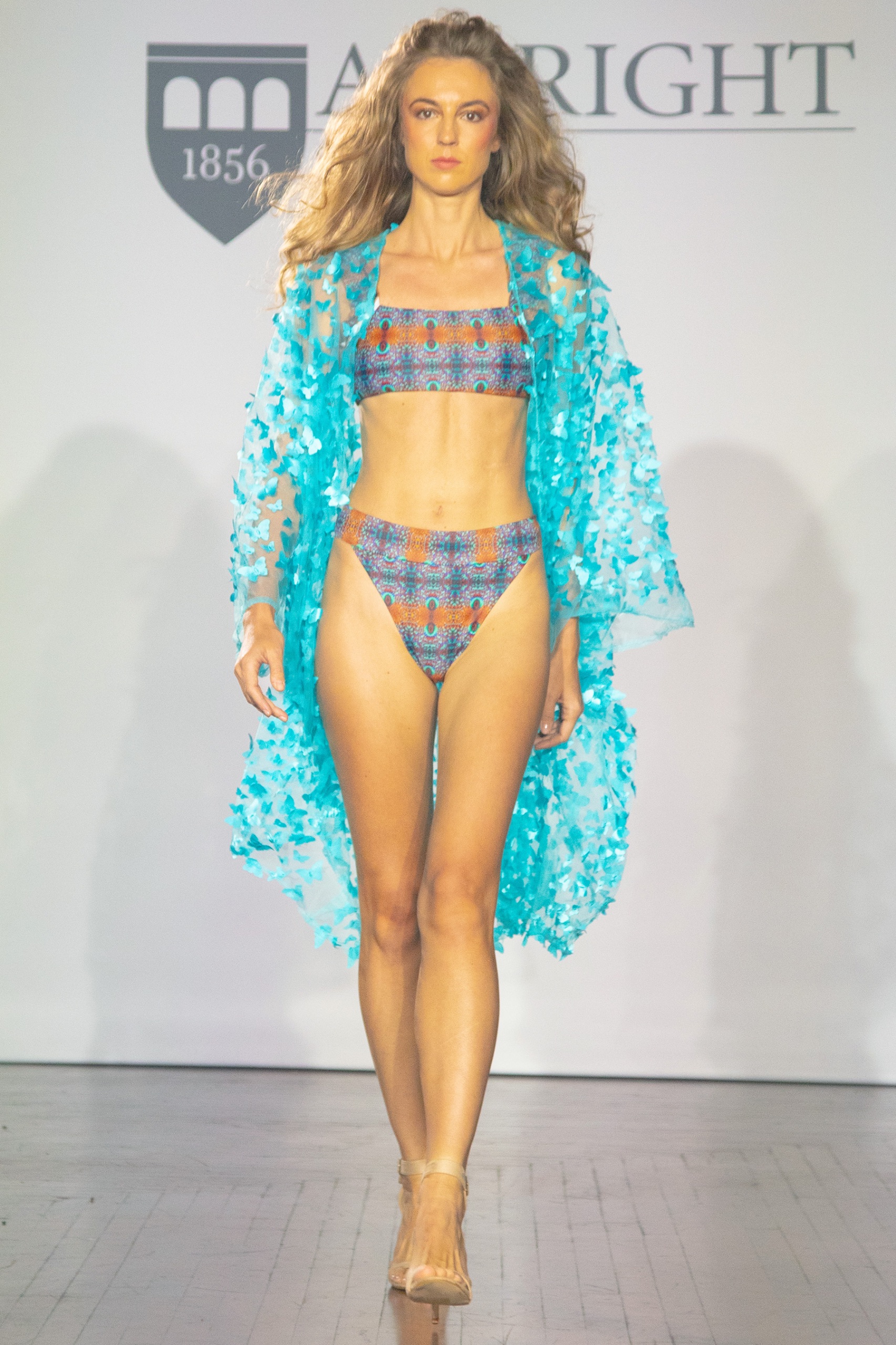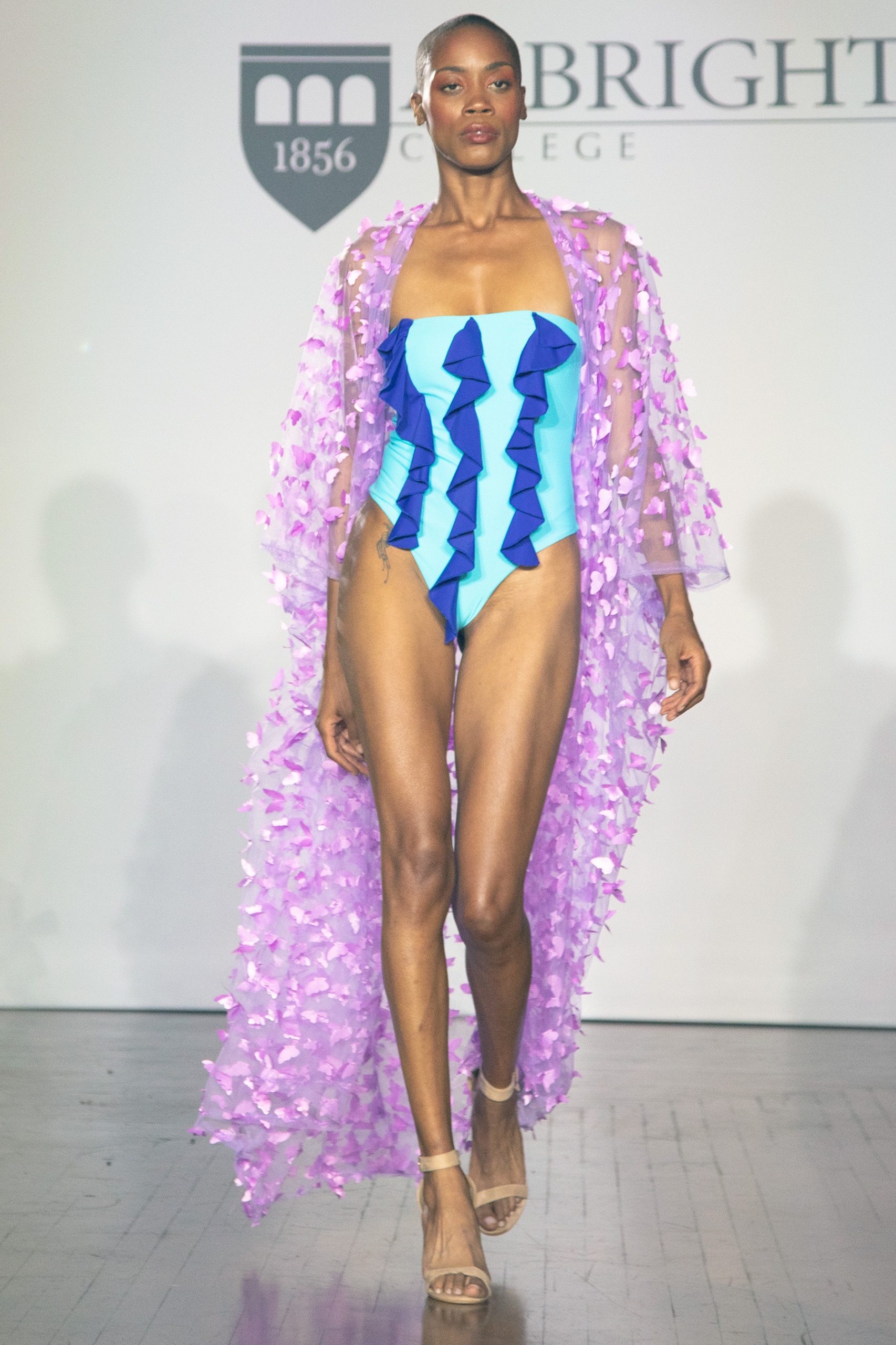 Abby Thomas-Ridgway showcased a series of airy, feminine day dresses crafted from appliquéd eyelet fabric. Her designs celebrated soft lines and delicate materials, creating an ethereal quality that was both refreshing and approachable. The transition to eveningwear was seamlessly handled by Lydia Simone, who introduced a striking swimwear collection. Among her standout pieces was a turquoise swim top paired with a lavender butterfly overcoat, which brought a unique flair to the runway.