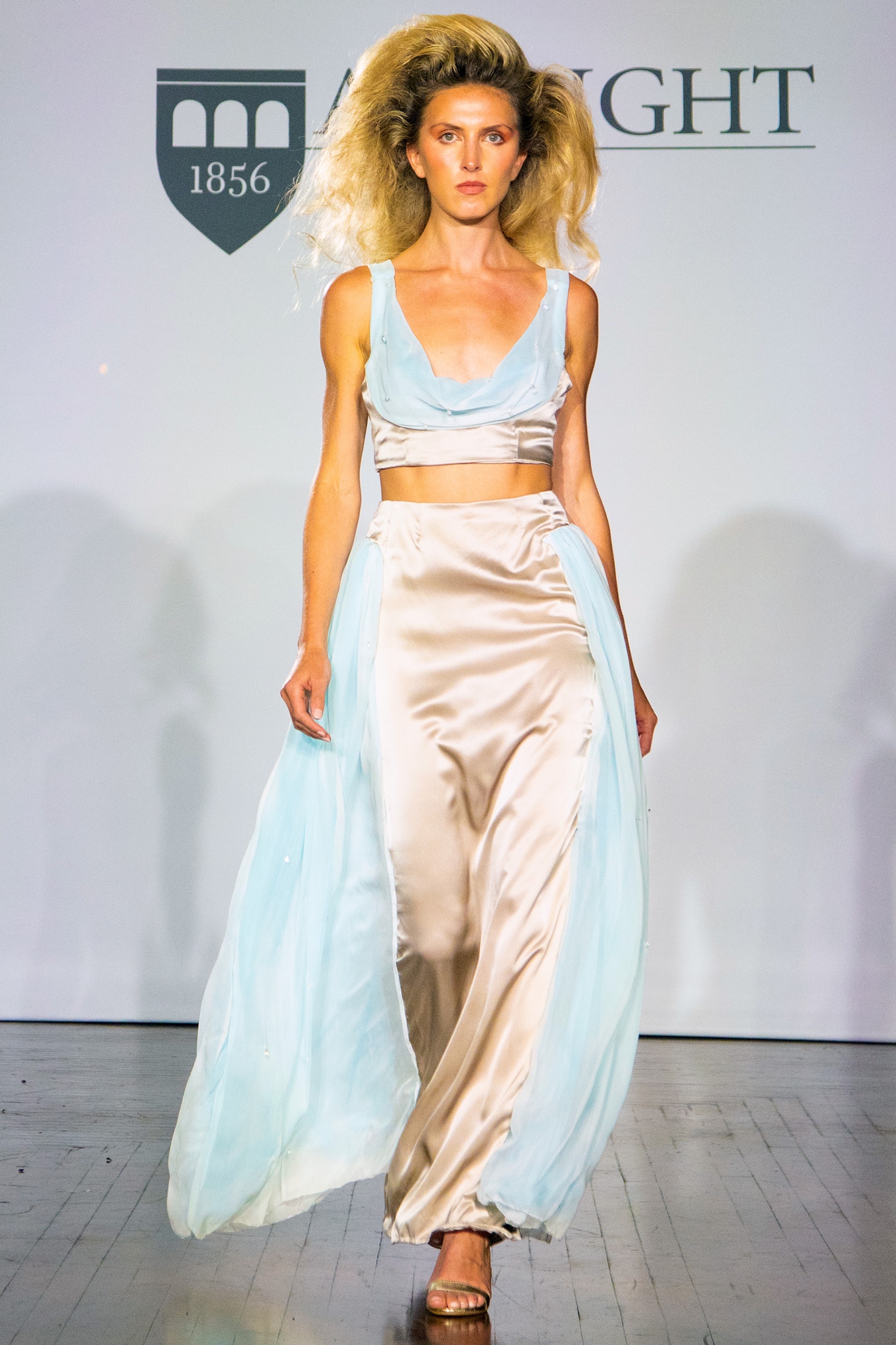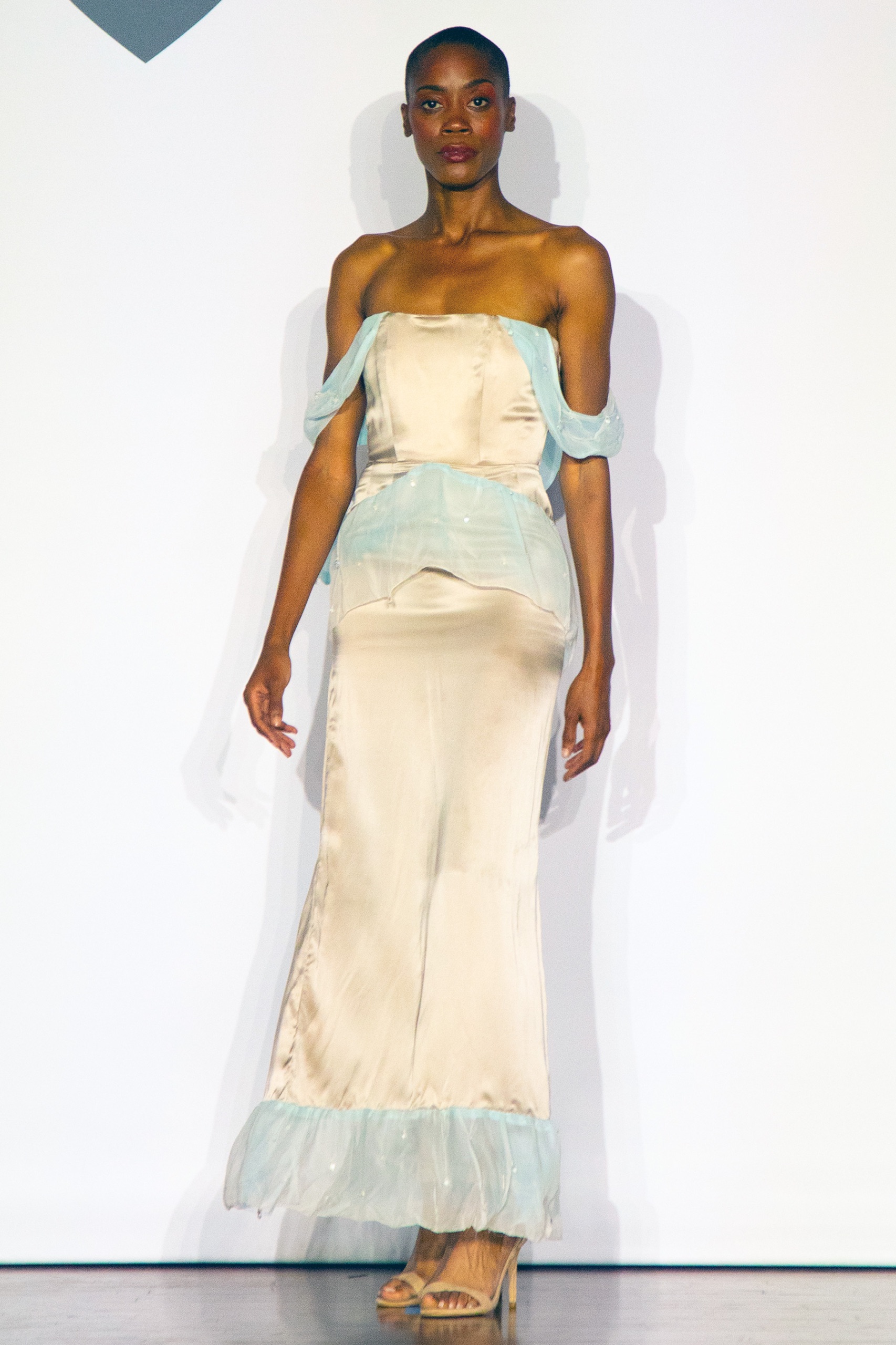 Mia Rezza showcased a selection of mocha silk charmeuse evening dresses, accented with sky-blue silk chiffon. The refined color palette provided a visually pleasing spectacle as the models gracefully navigated the event’s U-shaped runway. Each gown flowed elegantly, reflecting a sophisticated aesthetic that resonated with the audience.