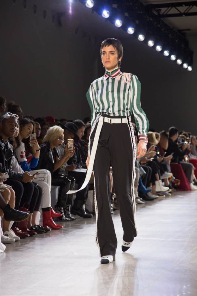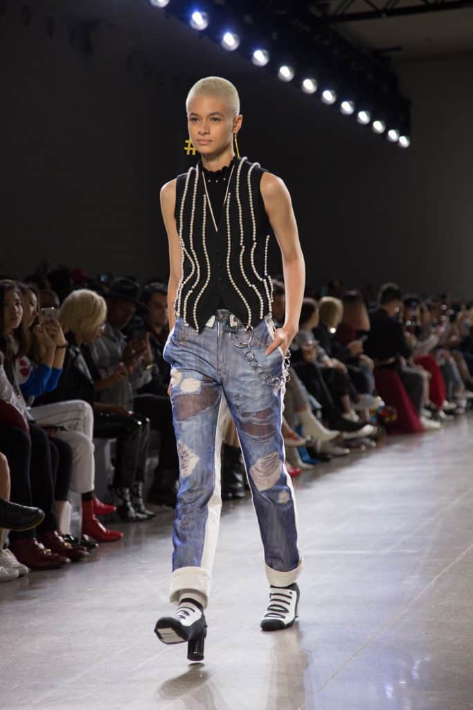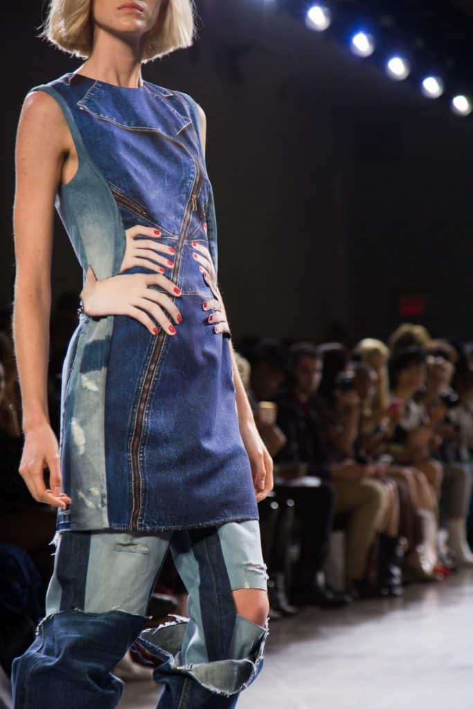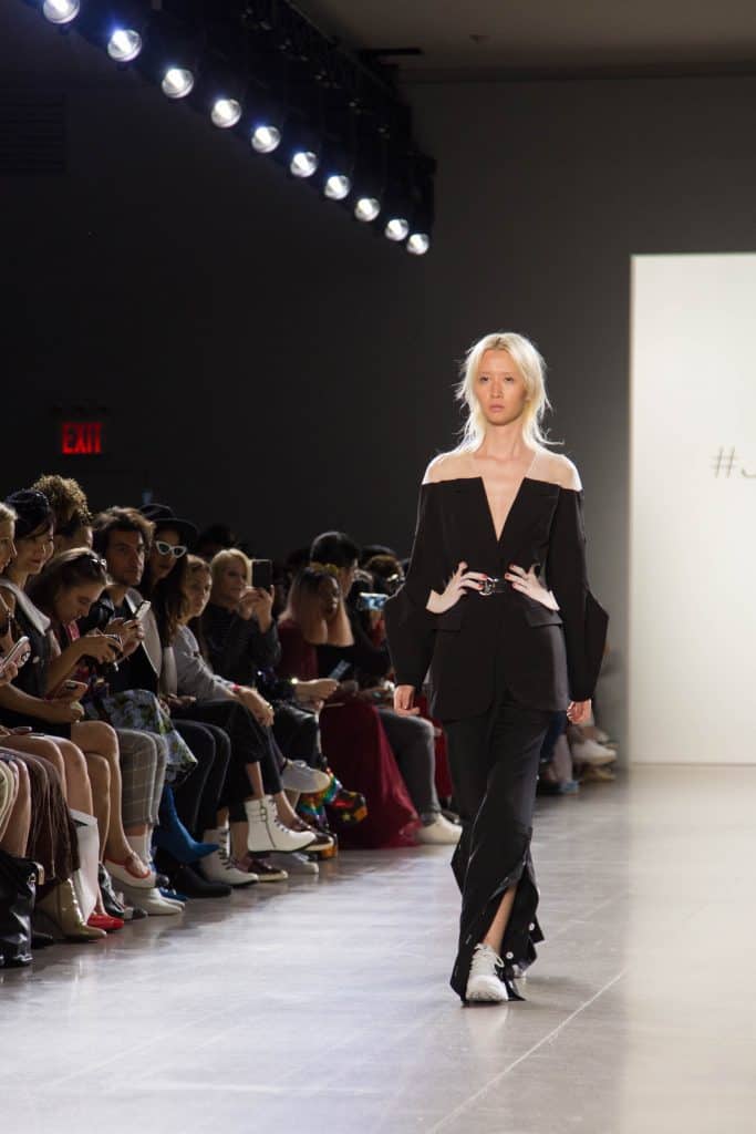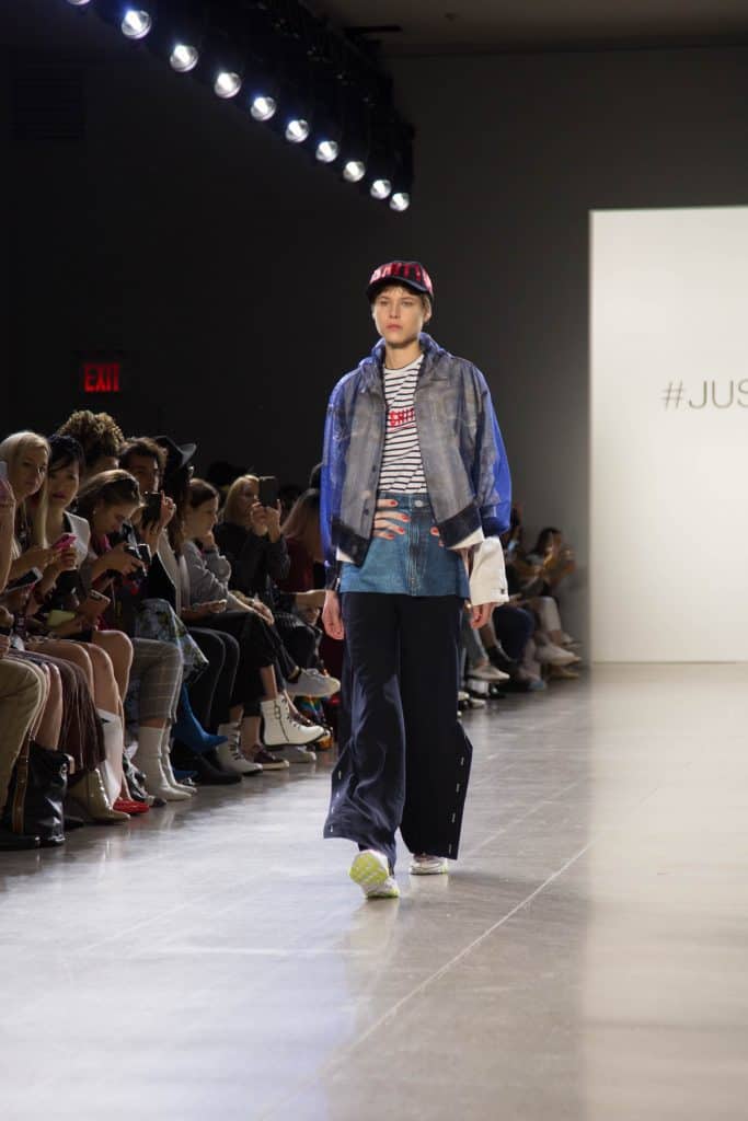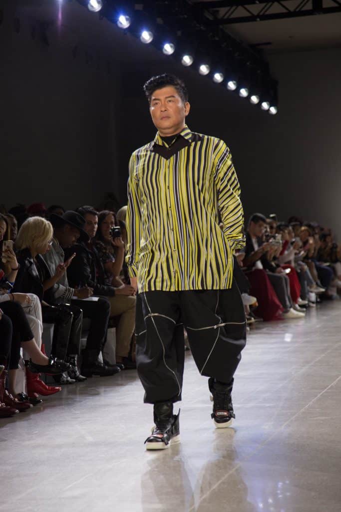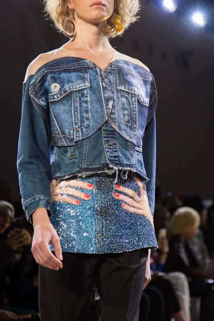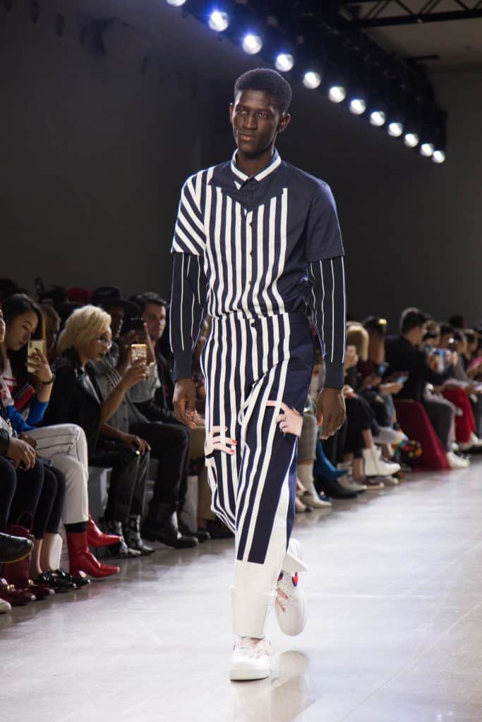As I browsed the garment racks backstage, I saw a funky and edgy variety of vertical stripes, fun patterns, a lot of denim and some really cool black and white shoes. I couldn’t wait to see how these would make their statement on the runway. The series of unbalanced geometric lines, twisted patterns and distressed tailoring are meant to “toy with the idea of high quality fashion”. As the models walked the runway with fierce confidence, I noticed their clothing was accented with hands strategically placed to mess with the visual perception, unable to tell if it’s the model’s hand or a print.