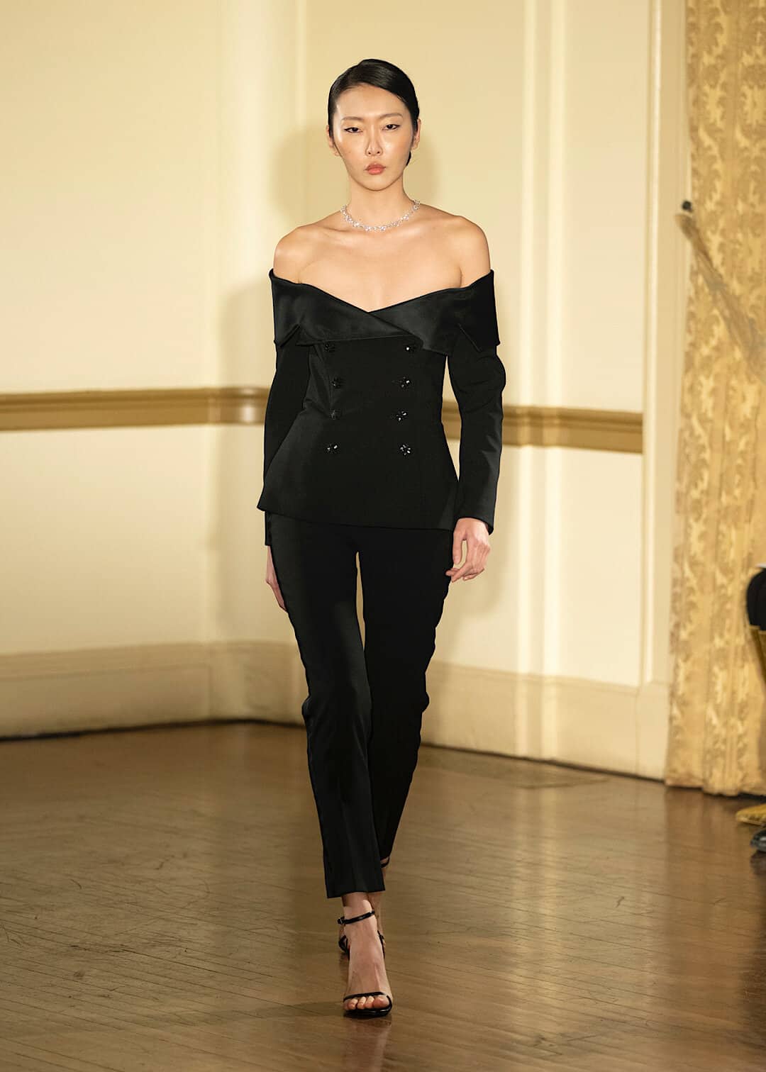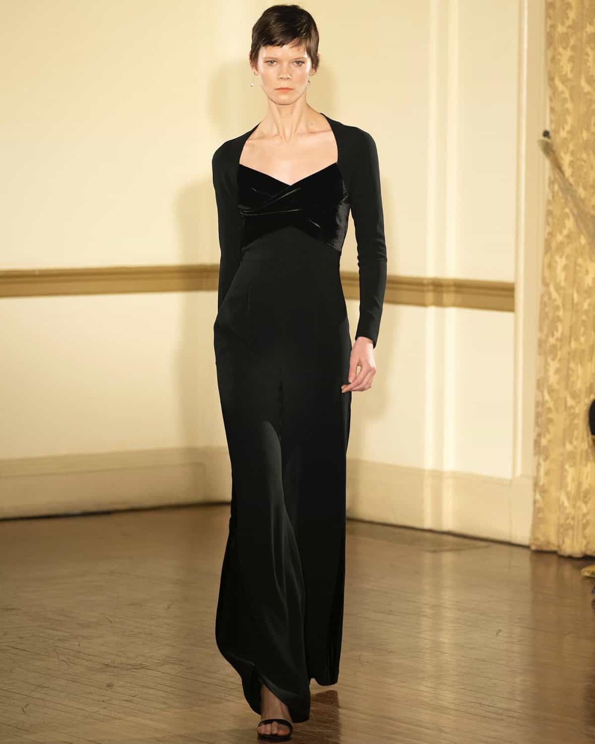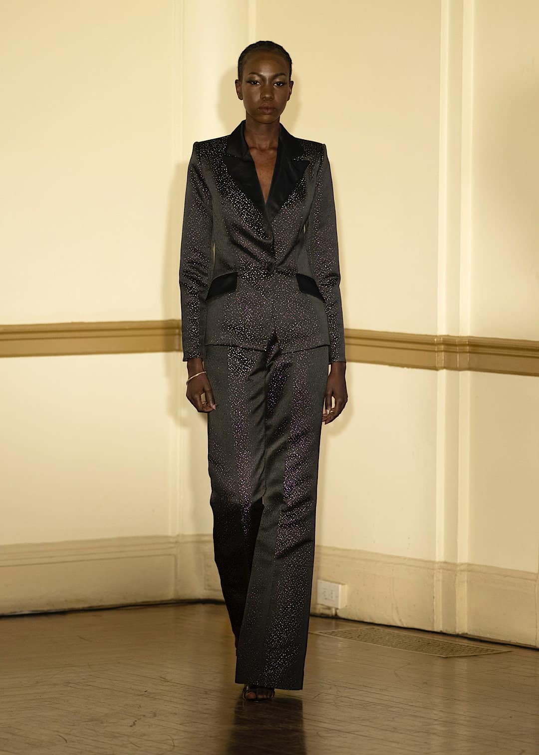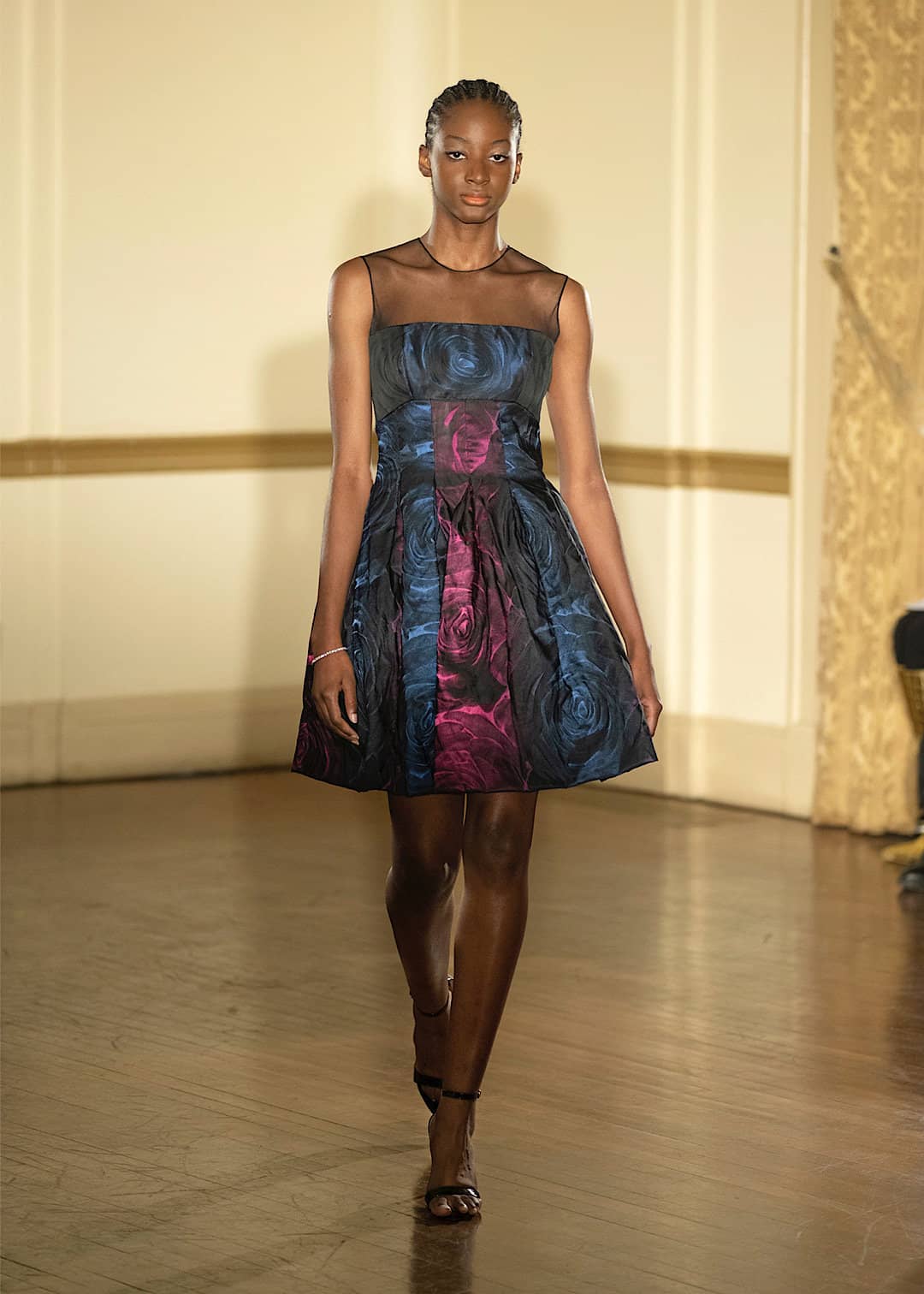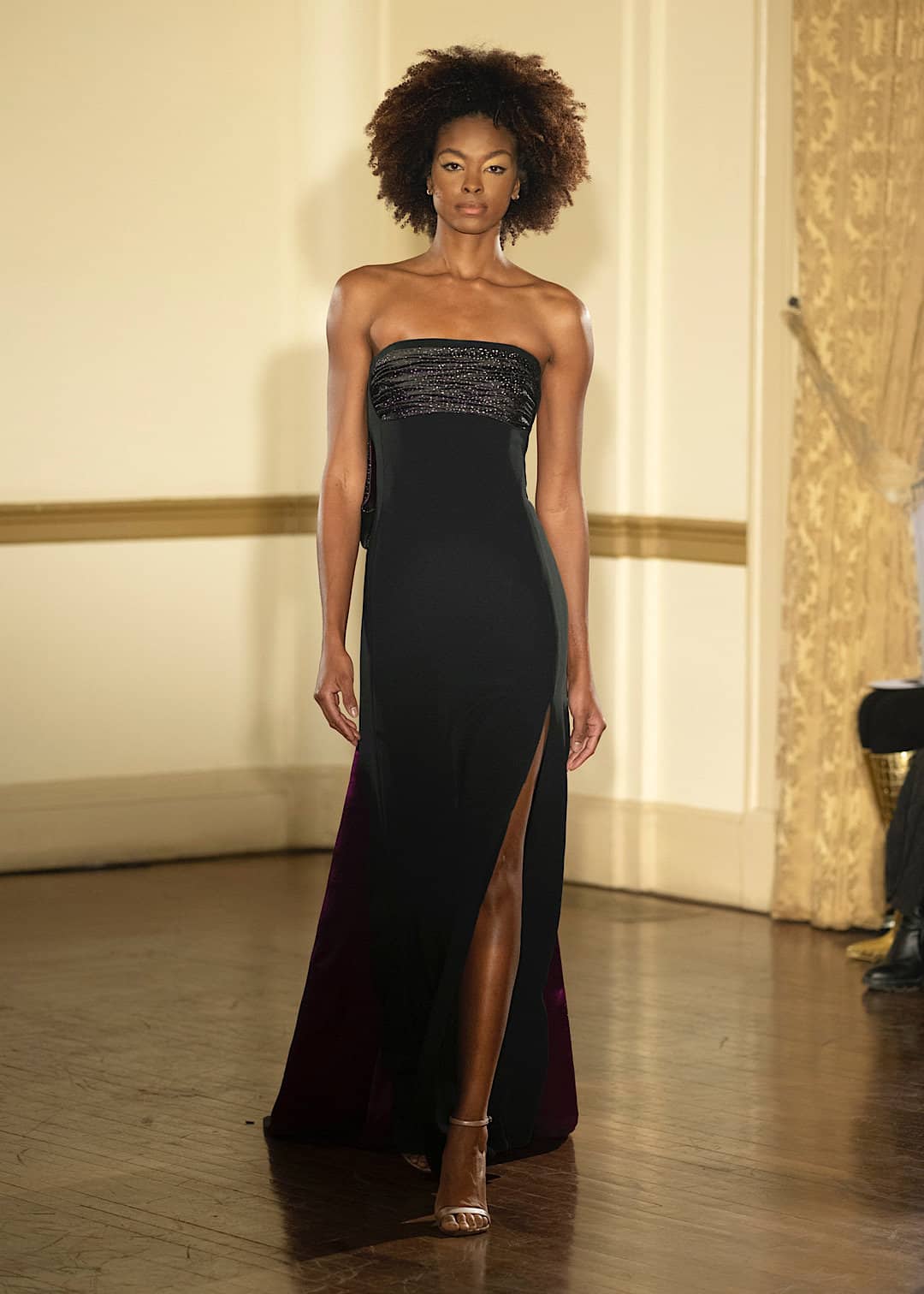 Kevan Hall dazzled attendees with his Fall 2023 collection, titled FACETED, which drew inspiration from the timeless standard “Diamonds Are Forever” and the glamorous rise of Dame Shirley Bassey in the 1950s. The designer’s gemstone palette featured a range of hues, from emerald and sapphire to ruby and amethyst, which provided a striking contrast to the luxurious velvets and buttery crepes used throughout the collection. Hall utilized crystalline structured materials to achieve a prismatic effect on many fabrics, producing a colorful spectacle for the eyes.