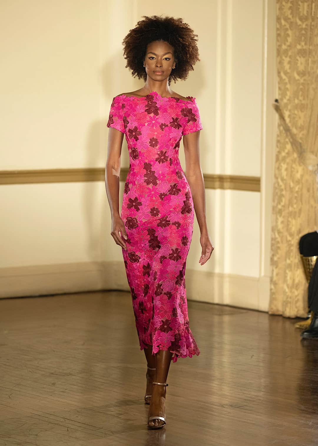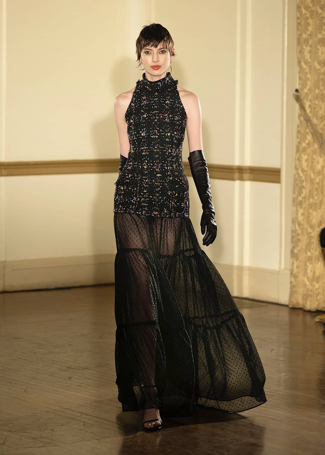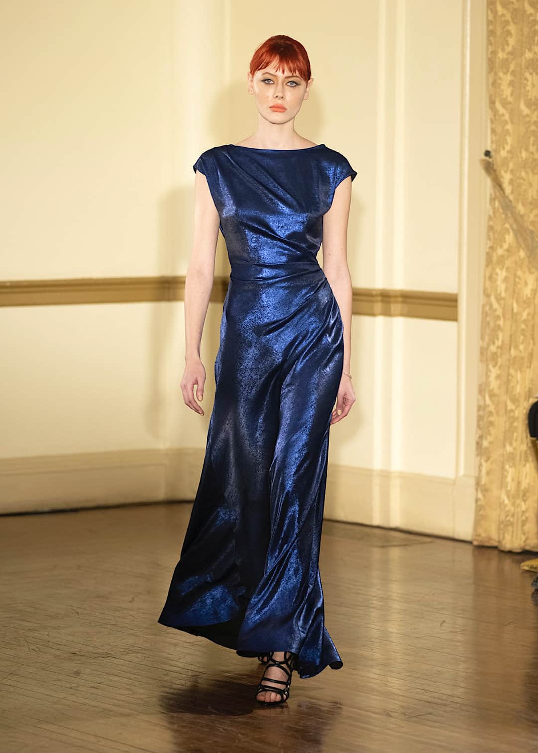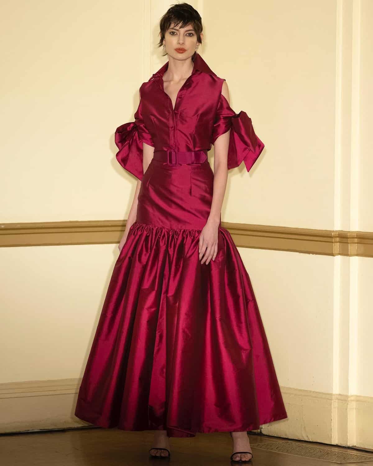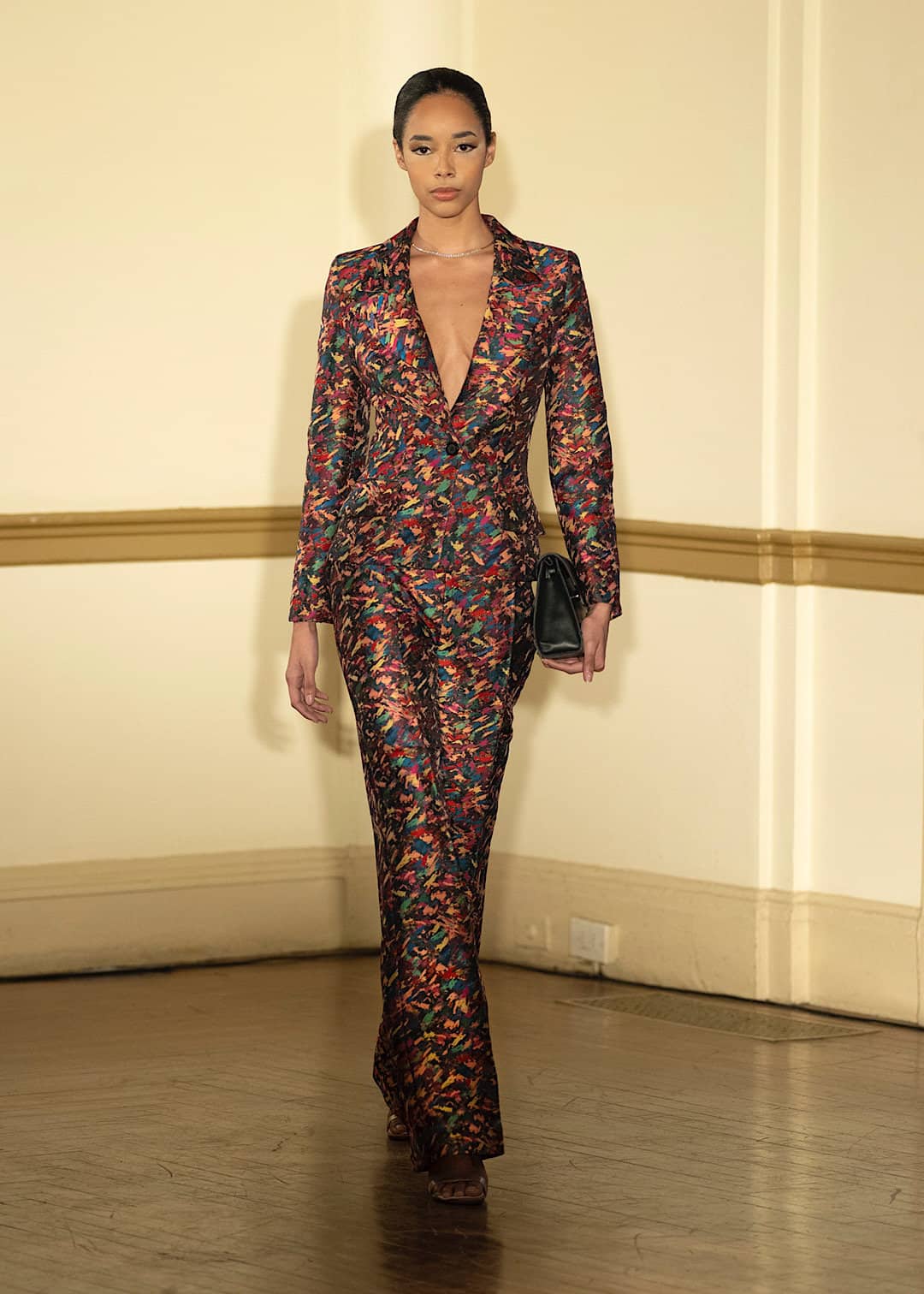 Kevan Hall dazzled attendees with his Fall 2023 collection, titled FACETED, which drew inspiration from the timeless standard “Diamonds Are Forever” and the glamorous rise of Dame Shirley Bassey in the 1950s. The designer’s gemstone palette featured a range of hues, from emerald and sapphire to ruby and amethyst, which provided a striking contrast to the luxurious velvets and buttery crepes used throughout the collection. Hall utilized crystalline structured materials to achieve a prismatic effect on many fabrics, producing a colorful spectacle for the eyes.