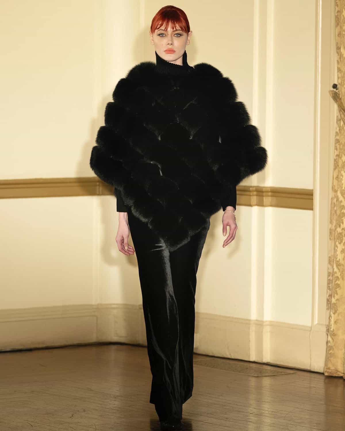 The collection included high-gloss metal accents, which grounded the Parisian classics and modern sleekness aesthetics in the present day. Additionally, Kevan Hall’s signature incomparable tailoring and sensuous draping silhouettes were showcased in the collection, along with hand-carved fur coats and matelassé, sculpted into images of roses, and unique tri-colored guipure laces woven from dyed threads.