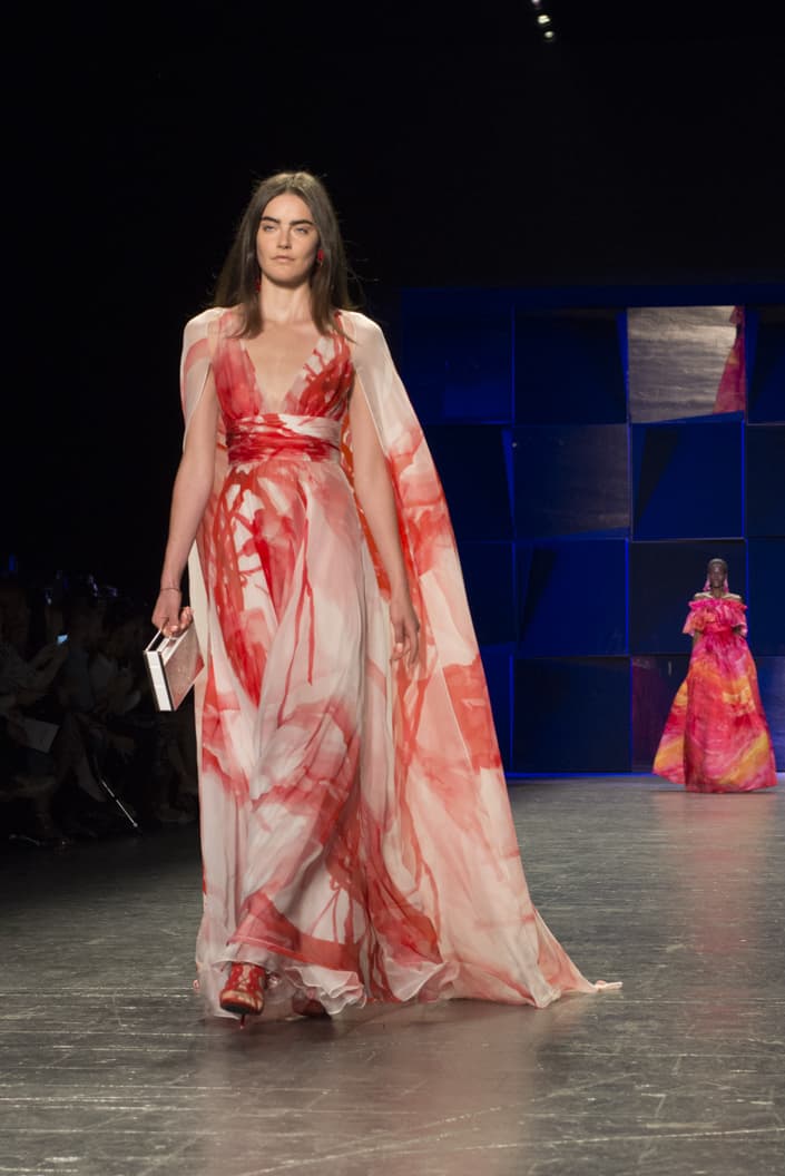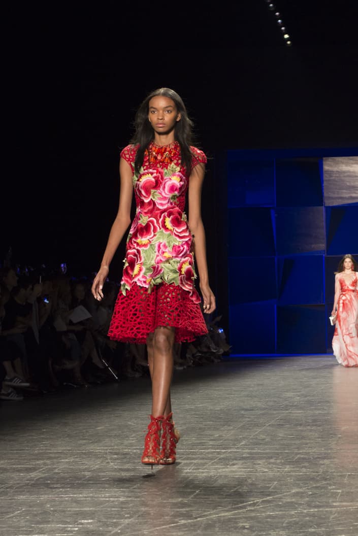 Naeem Kahn’s legacy from India to America was present in his new collection. As expected, the Naeem Kahn NYFW collection did not disappoint. Ready to wear dresses in bold reds, whites and blacks opened the collection, which then flowed into orange and yellow patterns. Later in the collection, designs featured more sheer fabrics accented with sparkling greens, purples and nude colors. Keeping true to the SS 2017 fashion, his collection featured lots of floral patterns and odes to summer.