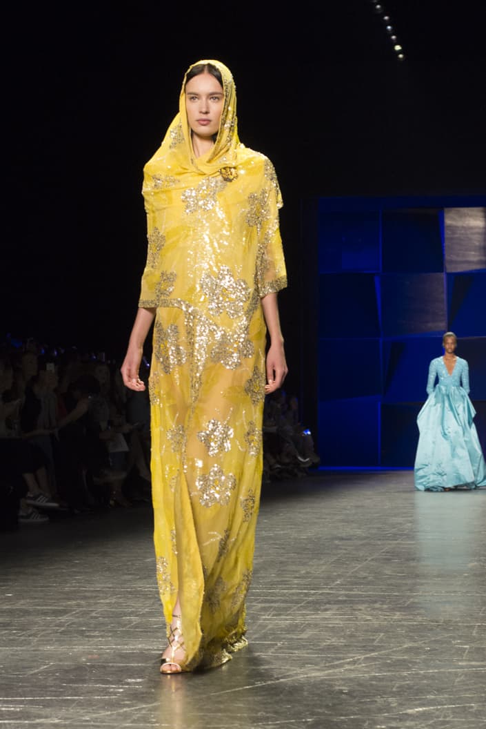 The collection made its way into extravagant gowns and pieces featuring sheer fabrics covered in fringe in vibrant yellows, pale blues, and bold sparkling reds. The impact that these bright colors made on the audience was clear. Naeem Kahn showed a lot of passion and innovation for his work and his vision as a designer and an artist.