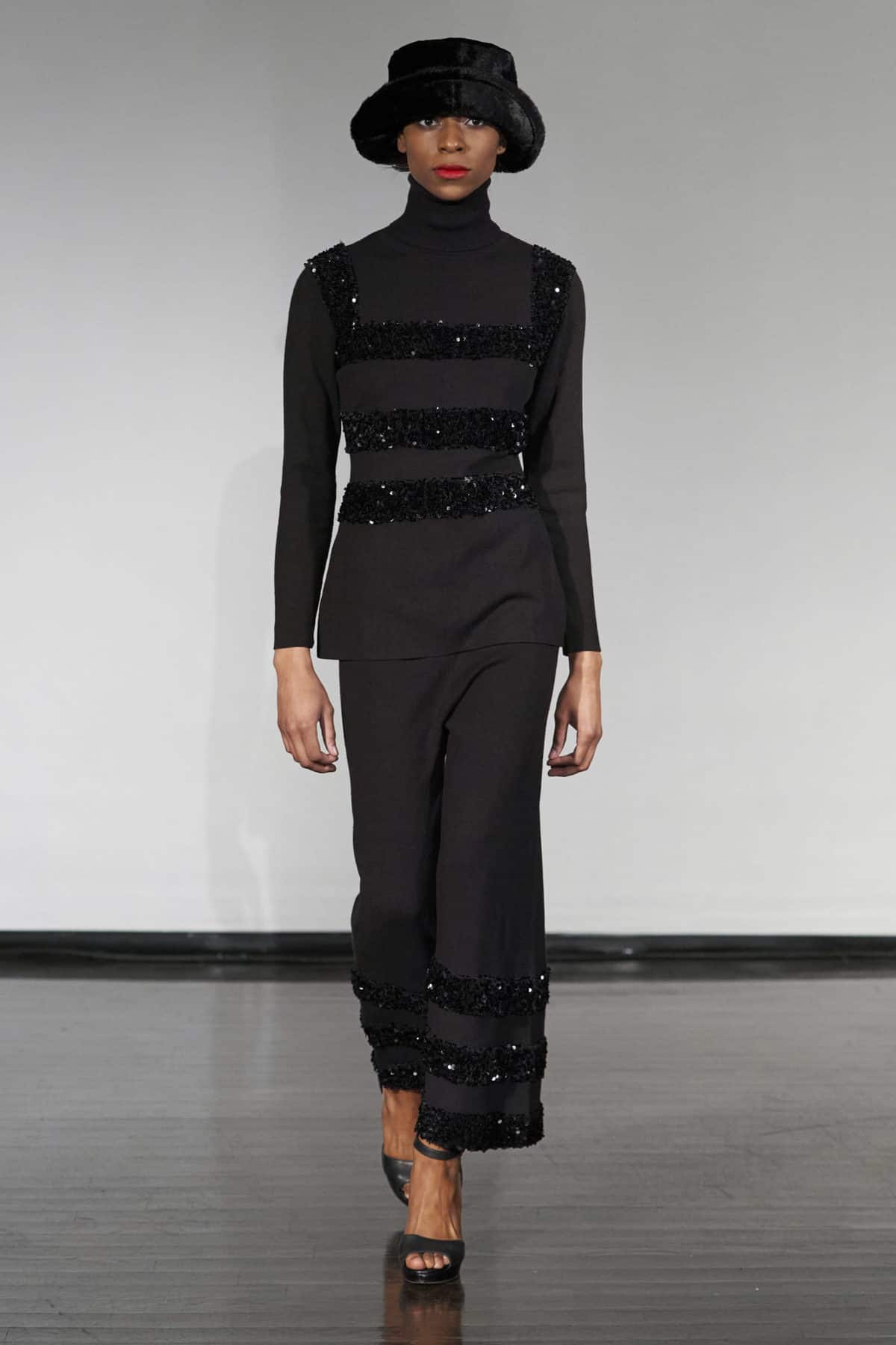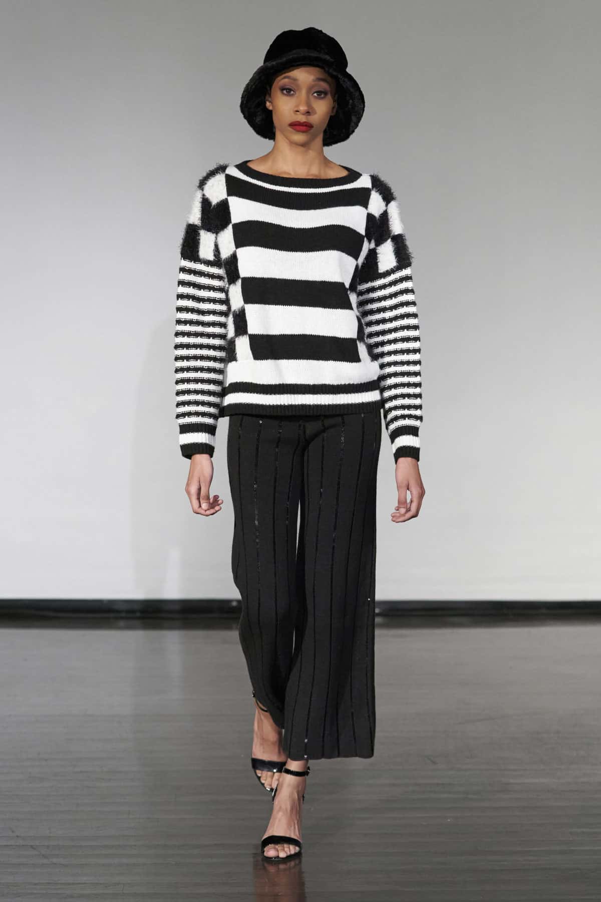 The designer played with the idea of slight transparency for the first look on the runway, a black ribbed set of long sleeve shirt and pants. Pinstripes were in the spotlight that night, alongside V-neck cuts. The faux fur bucket hat that’s been making its way back through TikTok in the past few months also appeared twice with a more classical structure, resembling the cloche hats that were so popular in the 1910s and 1920s.