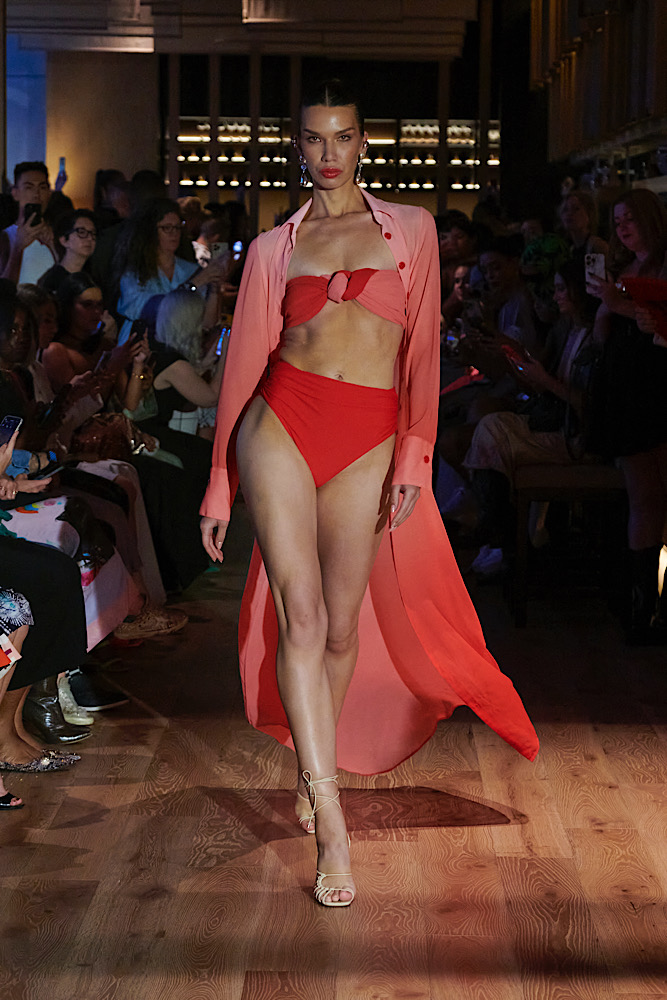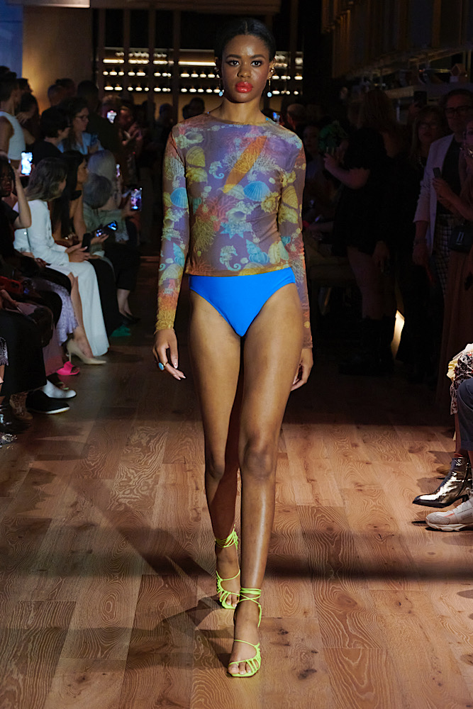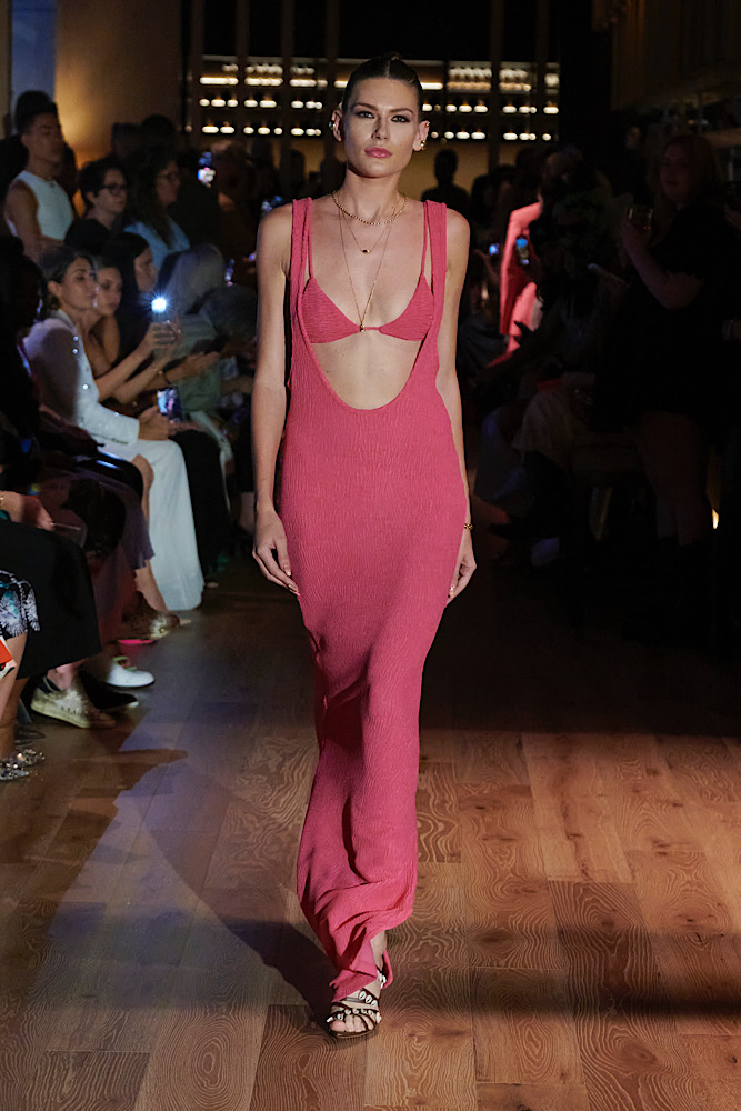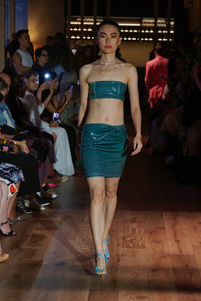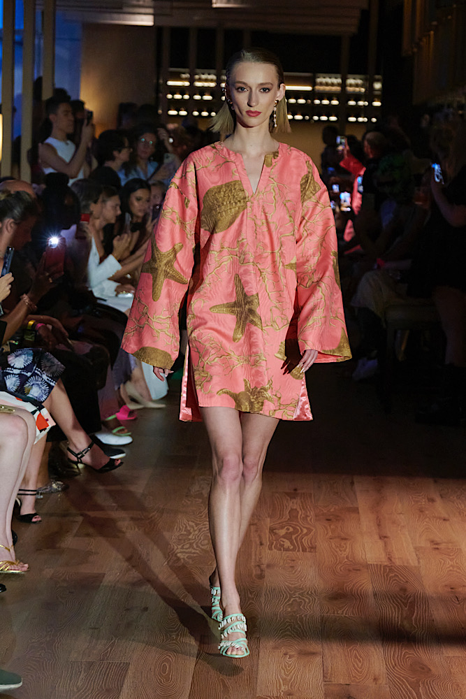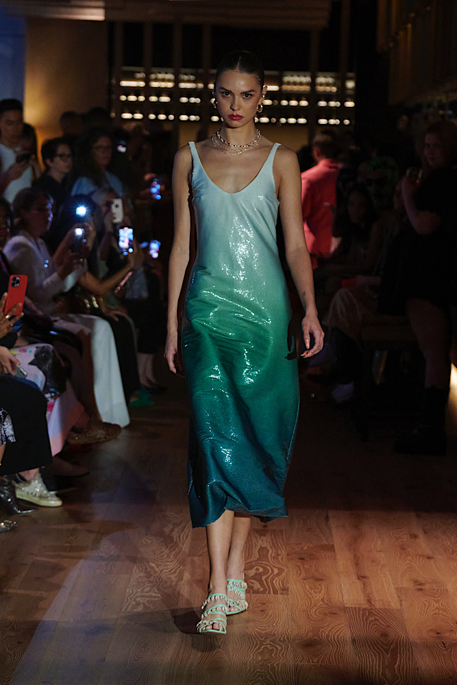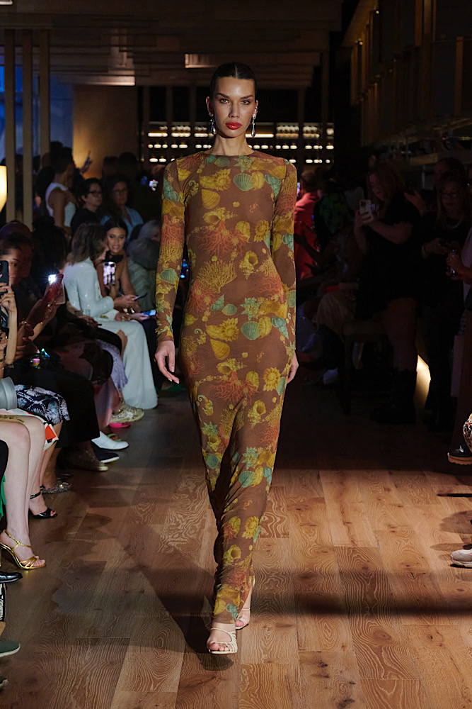 The color palette includes ombre pinks-reds, ombre greens-whites, cool beiges-browns, and sea blues. Garments crafted from eco-friendly textured Italian knits, such as Salamander Ibiza knit and the exclusive ‘Brain Coral’ knit, Neptune Coral and Sea Grass mesh, Flamingo crepe and satin, Conch Shell printed cotton, Nudibranch swim knit, and dazzling micro sequins offered a sensory journey through underwater hues and textures.