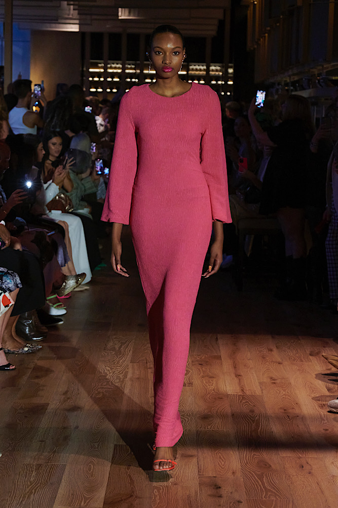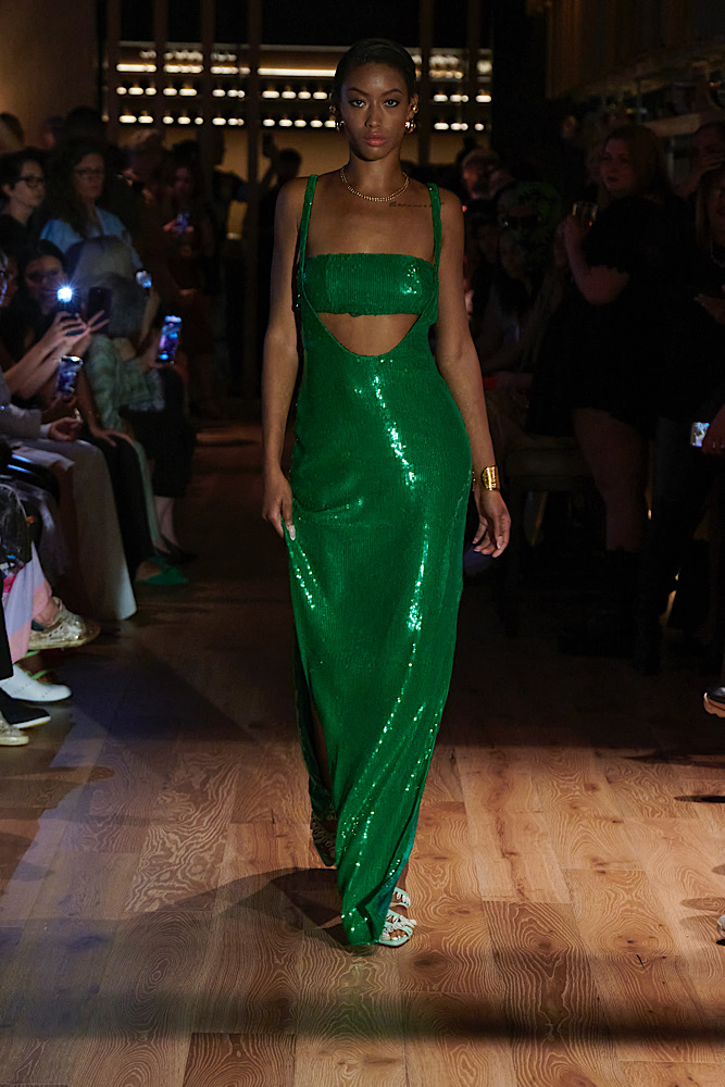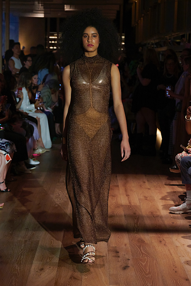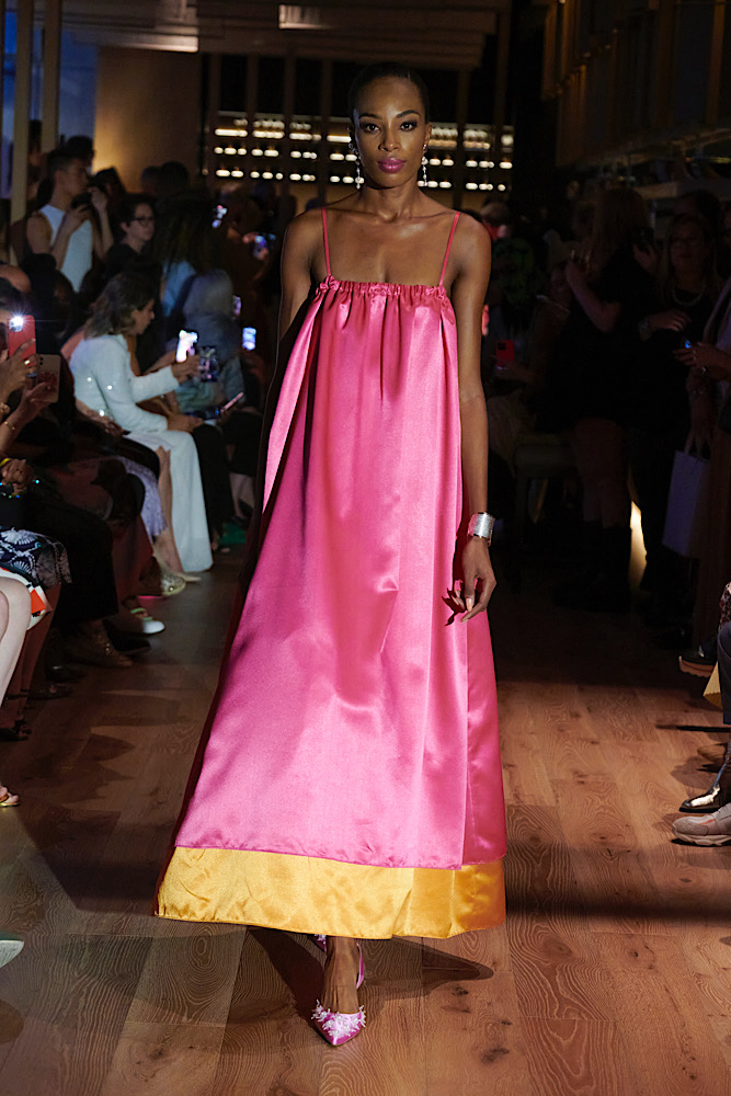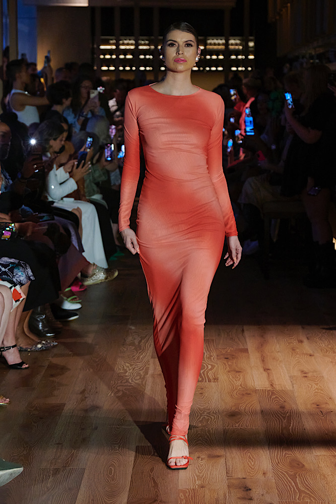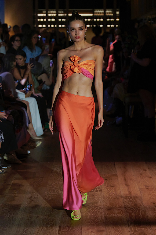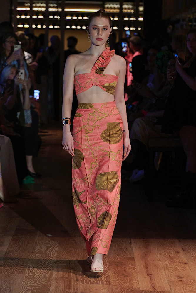 The color palette includes ombre pinks-reds, ombre greens-whites, cool beiges-browns, and sea blues. Garments crafted from eco-friendly textured Italian knits, such as Salamander Ibiza knit and the exclusive ‘Brain Coral’ knit, Neptune Coral and Sea Grass mesh, Flamingo crepe and satin, Conch Shell printed cotton, Nudibranch swim knit, and dazzling micro sequins offered a sensory journey through underwater hues and textures.