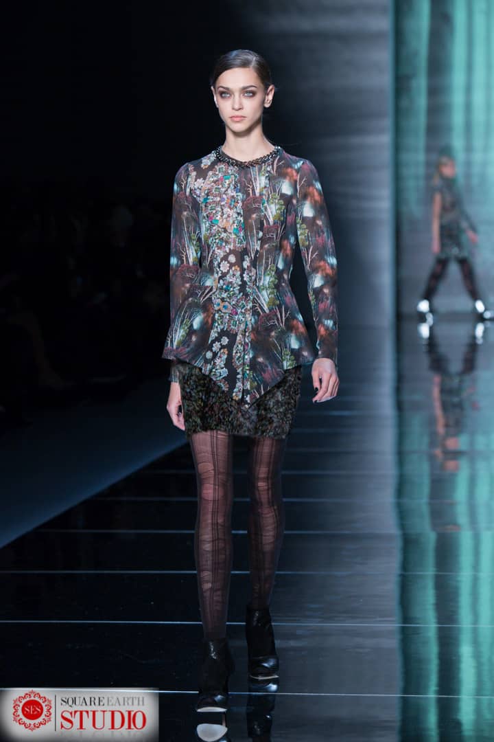 The collection also highlighted Nicole Miller’s pattern mixing genius. With the use of electric coloring, the designer wove a tale that beckoned the audience to venture into the deep dark woods of Fall. Models even wore foliage on their footwear! Slightly messy up-dos were prominent as simple side parts, dark nail polish, and blown out smokey eyes sharpened the sophisticated yet mysterious allure of the ensembles.