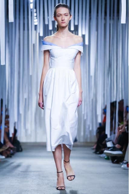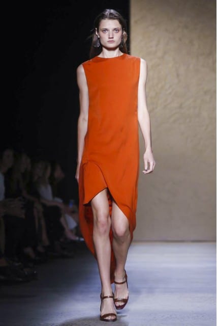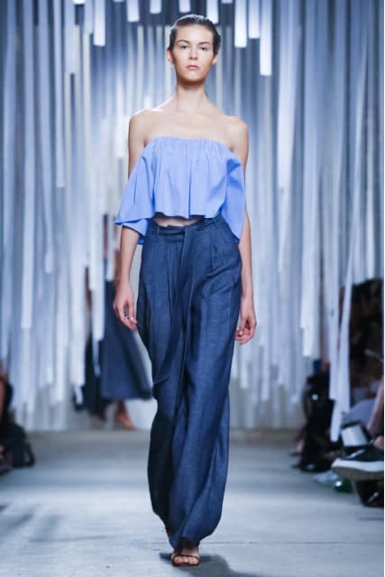 Milly’s collection again drives home, the popular trend of showing off everything above the bust. Whether it’s a tub top, halter neckline, or cut-out shoulders, there will be plenty of options for skin-baring this Summer! Milly also featured several looks with Deep V’s or cutouts over the stomach.
