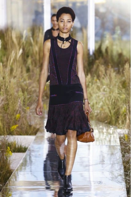 Coach also featured chokers on their runway, but instead of being apart of the clothes, they were separate necklaces. Stuart Vever’s print choices reminded me of paisley prints, but instead of the usual swirl, they were replaced with a million miny flowers, like an exposion. And of course, what is a Coach runway without some classic leather and suede?