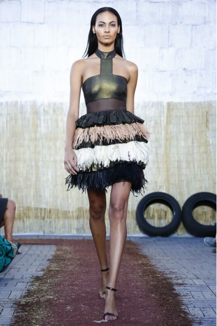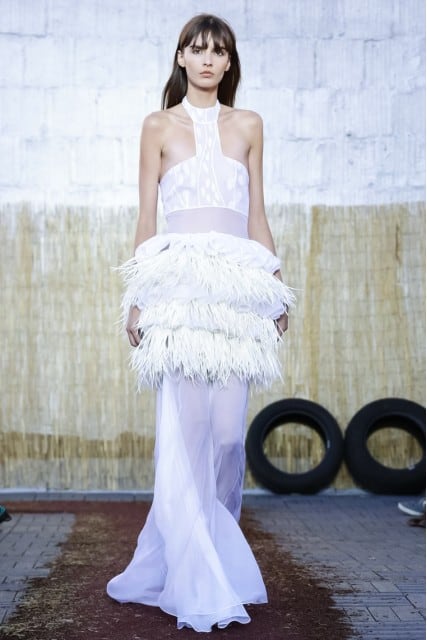 Sophie Theallet’s African meets Western wear collection featured a silhouette that has been pretty popular this week; The halter neckline with bare shoulders or as I like to call it, the tube top with a handle. It’s a sexy silhouette, baring shoulders and upper chest, but with the choker, or high collar it still exudes power. Sophie used feathers, to drive home her vision.