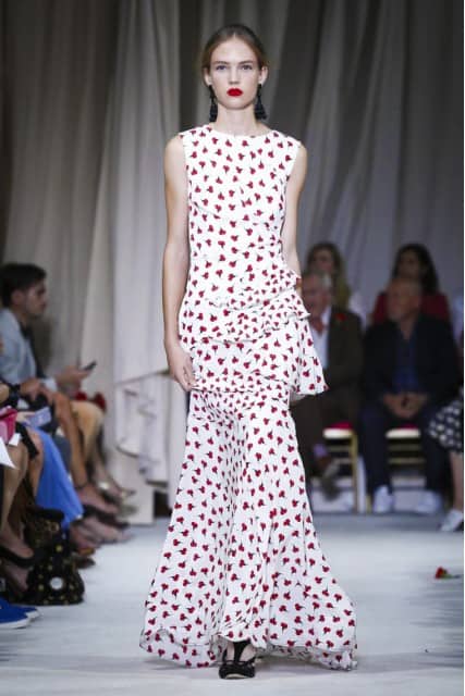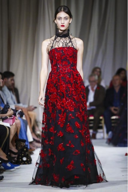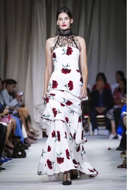 Peter Copping, Oscar’s successor did not disappoint with his collection for Spring. At first glance, the collection radiated a Spanish theme. I immediately thought of flamenco dancers with their striking dresses, flowers in the hair, and bold red lips. The shade of red that was infused throughout the collection, made me think of roses, and if you look closely at the reds, they are flowers.