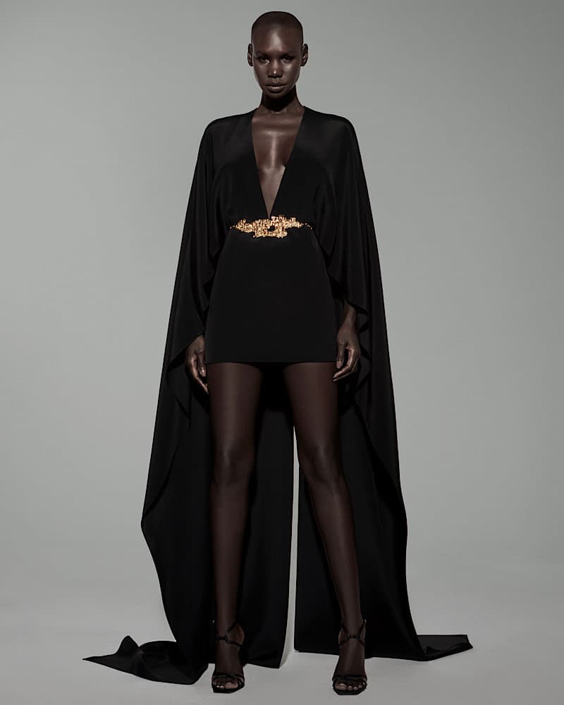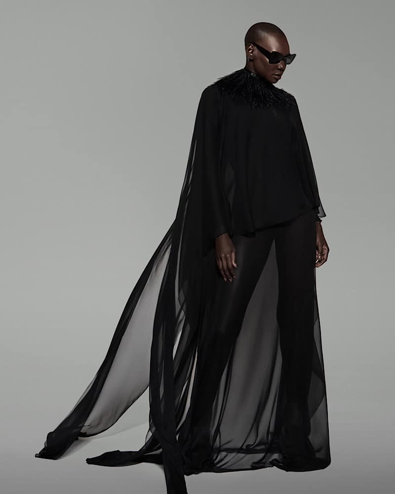 Pepe Muñoz, a fashion illustrator, also collaborated with Rodriguez to add his flair and interpretation to the collection. The Fall/Winter 2023 collection includes 32 looks, with reinterpretations of the iconic caftan. Key styles include a double-layer sheer silk georgette caftan gown with embroidered feathers, a black cotton poplin bustier top with gold foiling, and a crepe mini dress with an ostrich feather neckline.