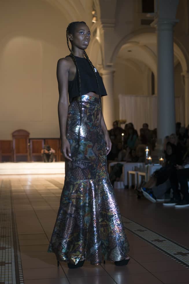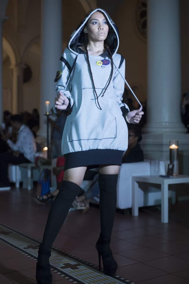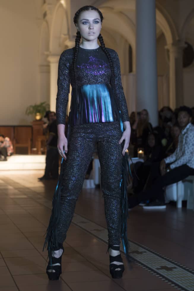 The line made a smooth transition from printed shirts and hooded sweatshirts to interesting metallic gowns and skirts. Fascinated by these eye-catching designs, I eagerly anticipated the next girl to walk down the runway. The outfits featuring the metallic colored designs held elements of the previously shown streetwear style, including a hooded top and matching shorts and a line of fringed dresses.
