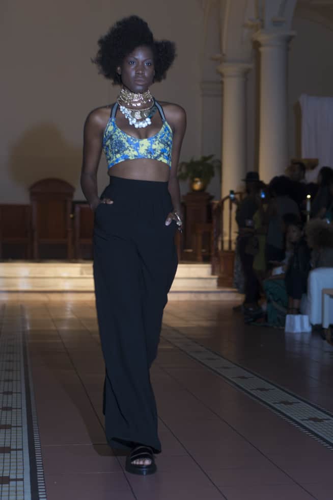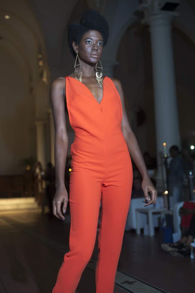 The showcase was finished with a few gowns and short dresses. Walking before me was an outfit of a button down short sleeve top and matching shorts that radiated a hypnotic blue. Bold blues and oranges, varied patterns and designs, and full jumpsuits paraded down the runway.