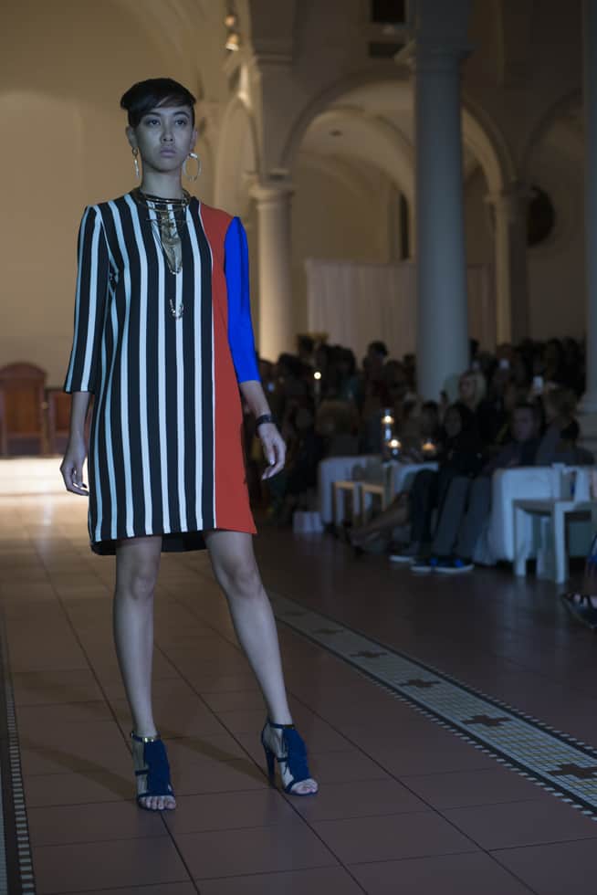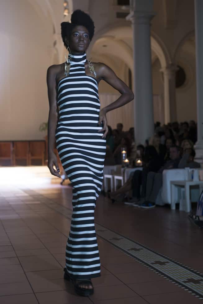 A white body suit wrapped up the vibrant segment, and made a transition into my favorite designs of the collection. The segment included striped patterns and intricately cut fabrics, allowing each design to flow and come to life. Vibrant reds and luscious blues were integrated into this portion of Samantha Black’s Spring/Summer collection.
