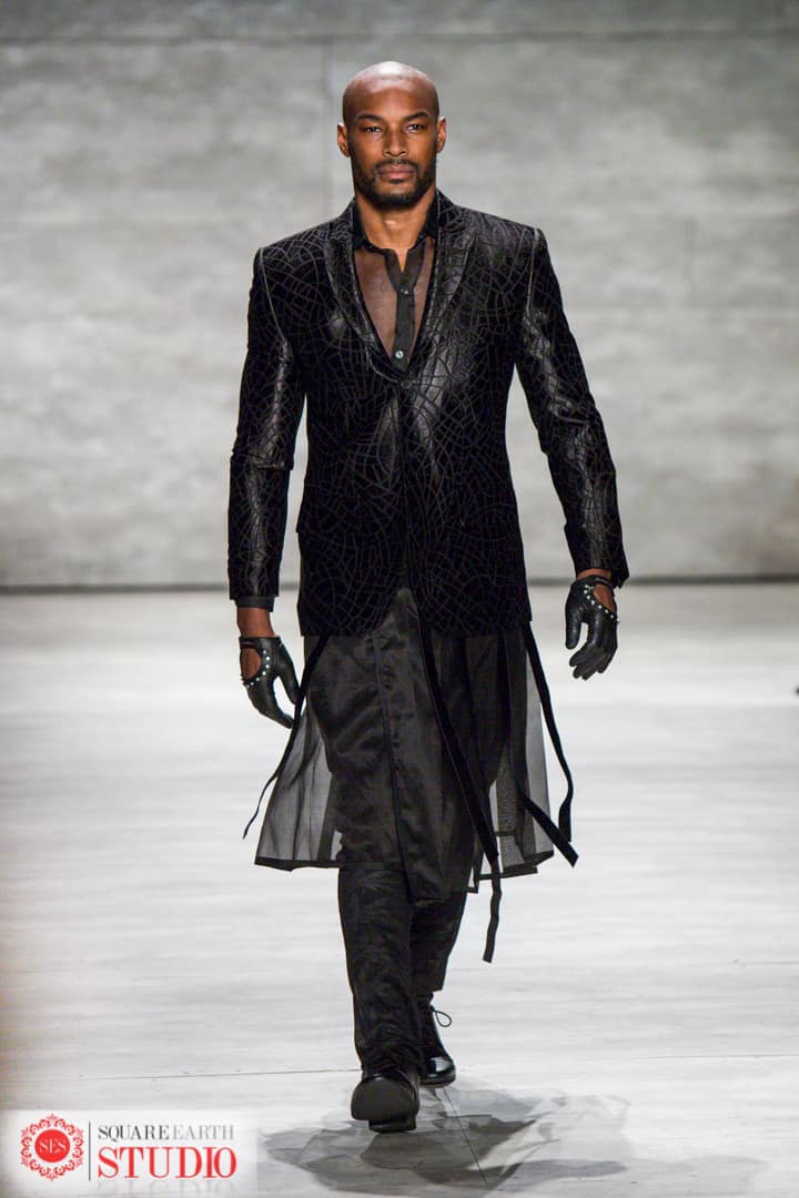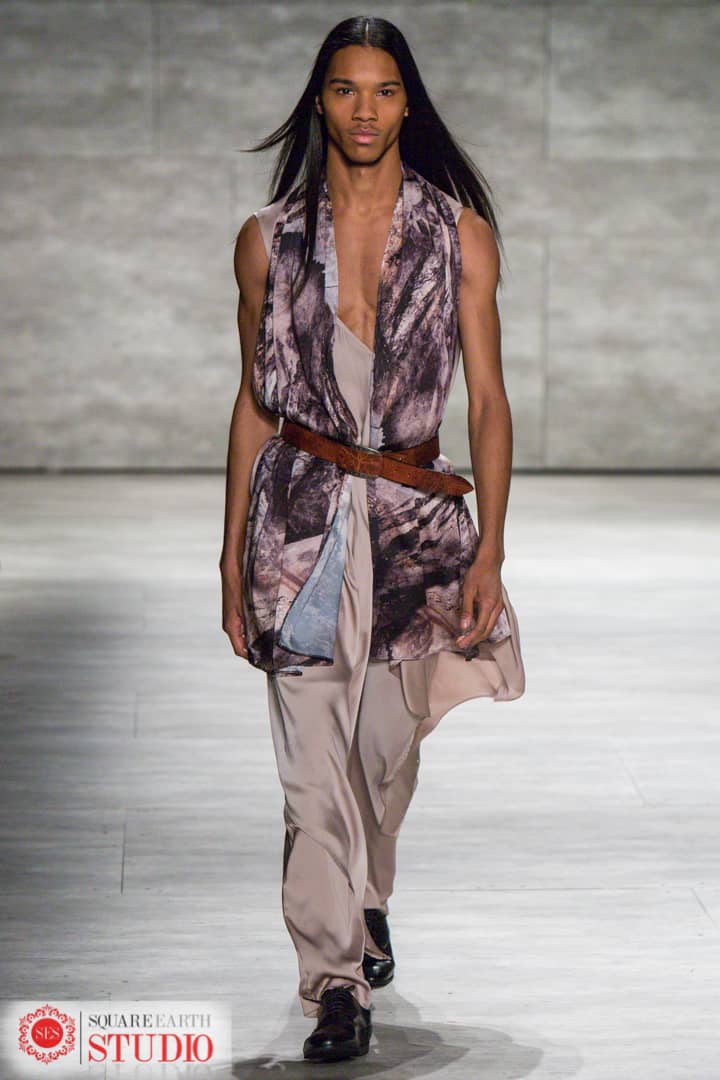 David Tlale presented an array of clothes, that appear to feature a print that he may have designed himself. With modern technology, if a designer can’t find a print that he likes, he can always design one himself and have it printed onto fabric. This looks to be what David Tlale did with his first few looks that featured a purple, tan, and black paintbrush print that looked like an artist painted onto the canvas. I also felt a bit of an Asian-inspired vibe from a few looks that featured small obi-type belts, & wrap silhouettes.